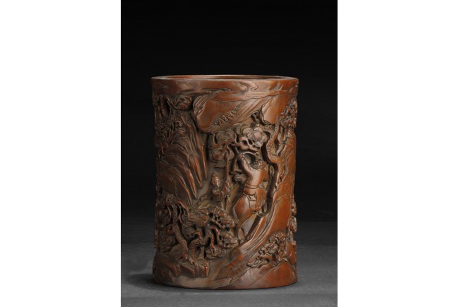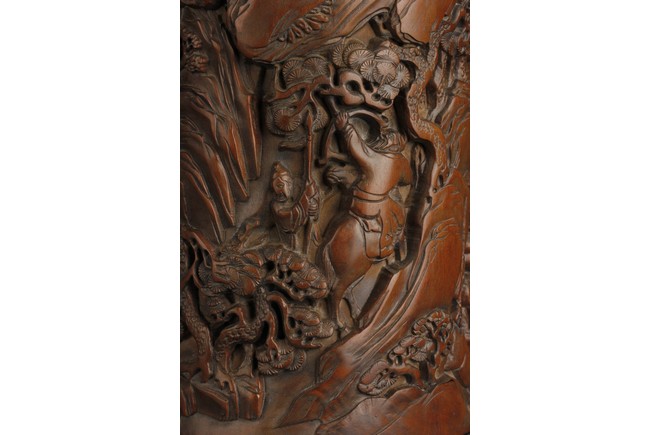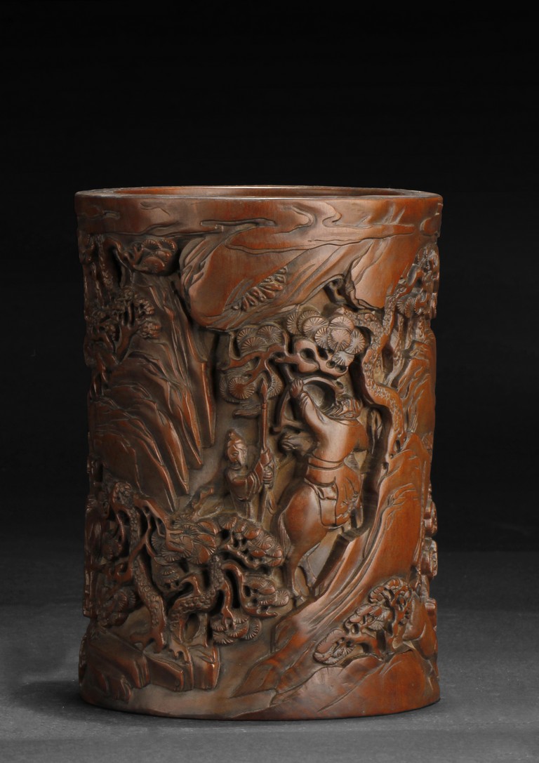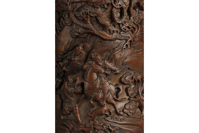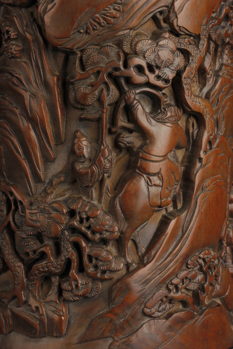 19th century. Of cylindrical form, slightly concave inward, the exterior low relief carved with a hunting scene, with horse riders and their attendants amidst dense forest near mountains, hunting for games such as rabbit and birds.