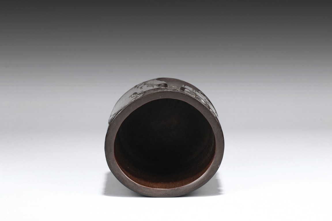 A CARVED FISHERMAN BAMBOO BRUSH POT 清 竹雕老翁垂钓笔筒