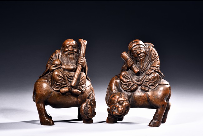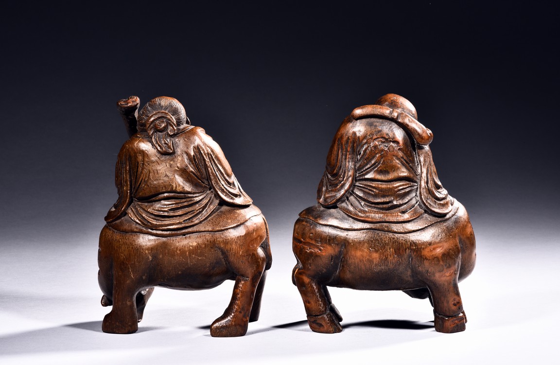 Comprised of a shou and lu star figure shown sitting on a buffalo, the shou star shown holding a peach and staff, the lu star shown holding a scroll, both with benevolent expression.