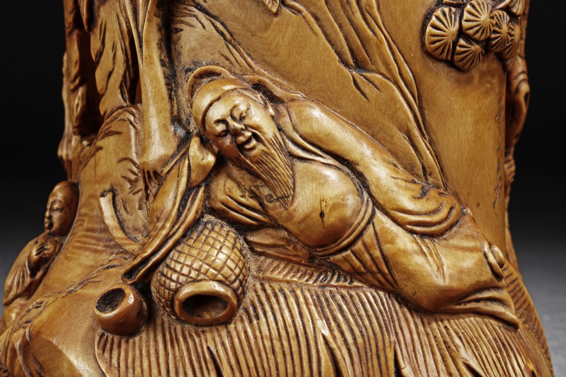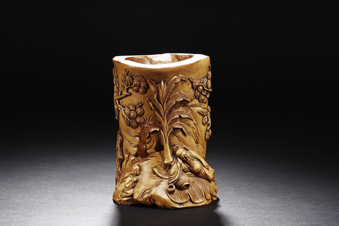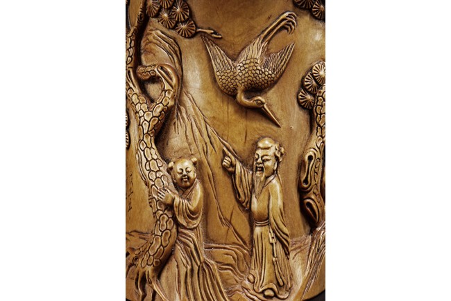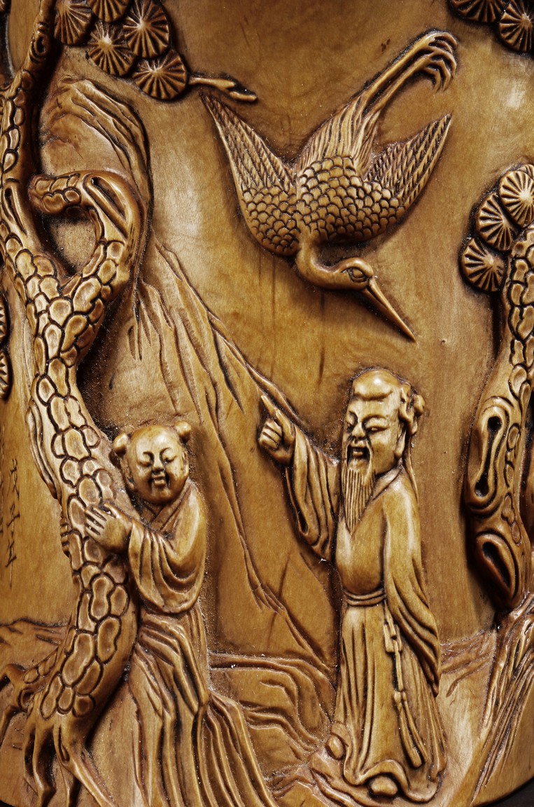 The exterior deeply carved in relief to depict a scholar wearing a loose robe pointing his finger up, asking a young child grabbing the pine trunk nearby, and further detailed with a crane in flight on the top; on the reverse it is carved to depict a reclining scholar under a banana tree on a day-bed with a young attendant on the side. One side with inscription.
