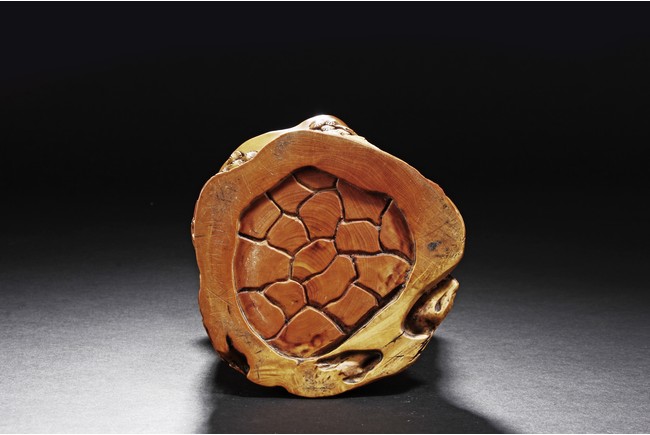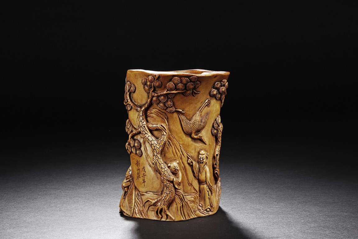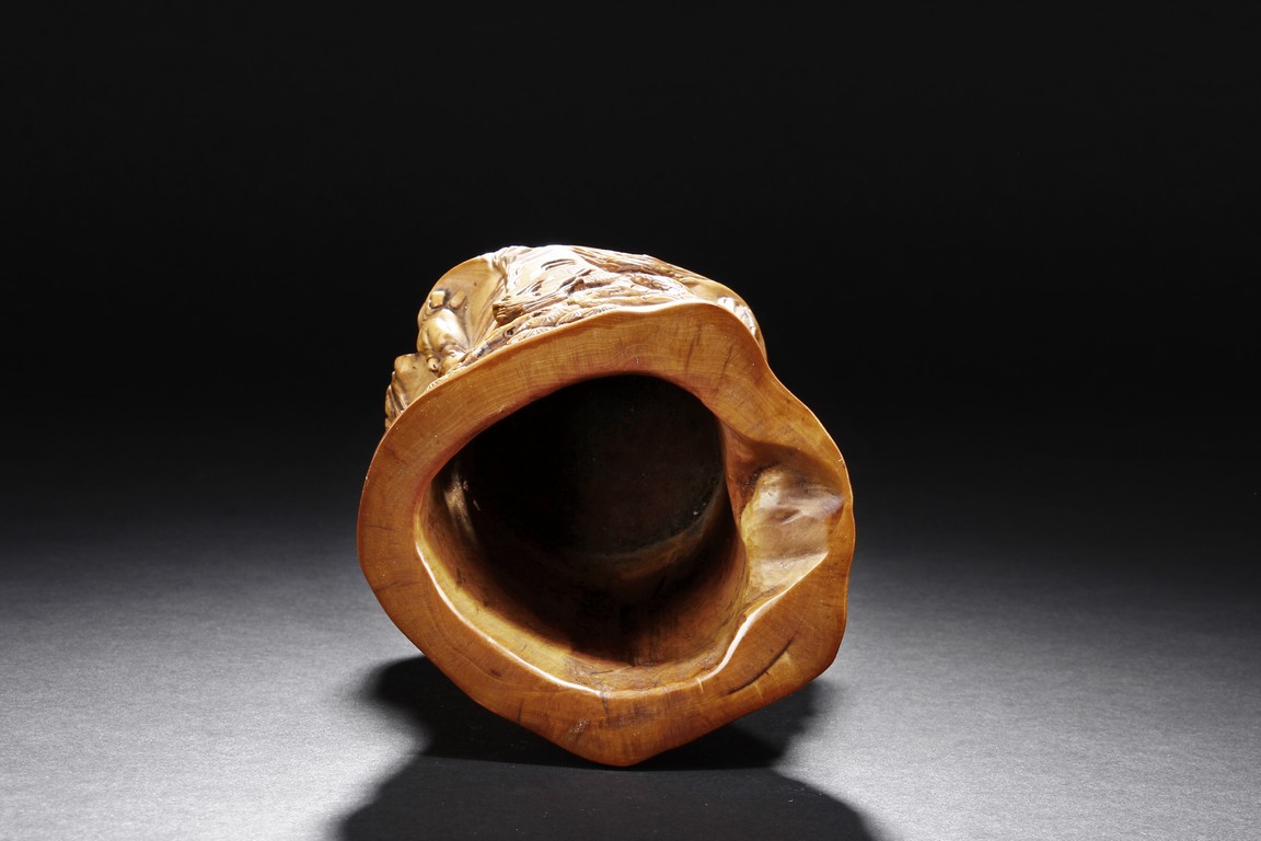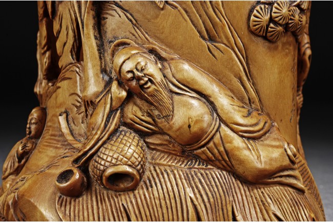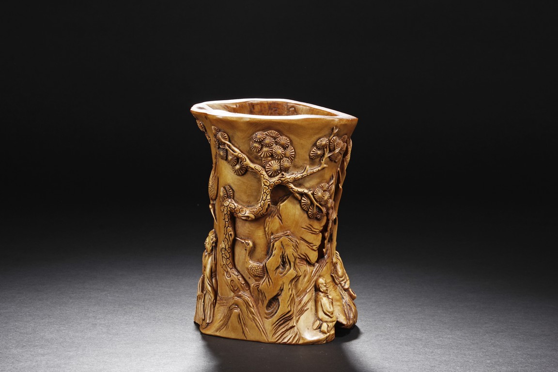 The exterior deeply carved in relief to depict a scholar wearing a loose robe pointing his finger up, asking a young child grabbing the pine trunk nearby, and further detailed with a crane in flight on the top; on the reverse it is carved to depict a reclining scholar under a banana tree on a day-bed with a young attendant on the side. One side with inscription.