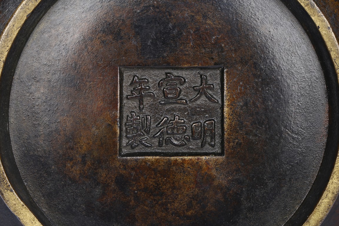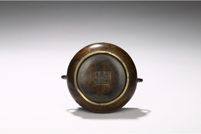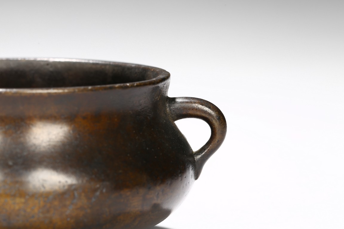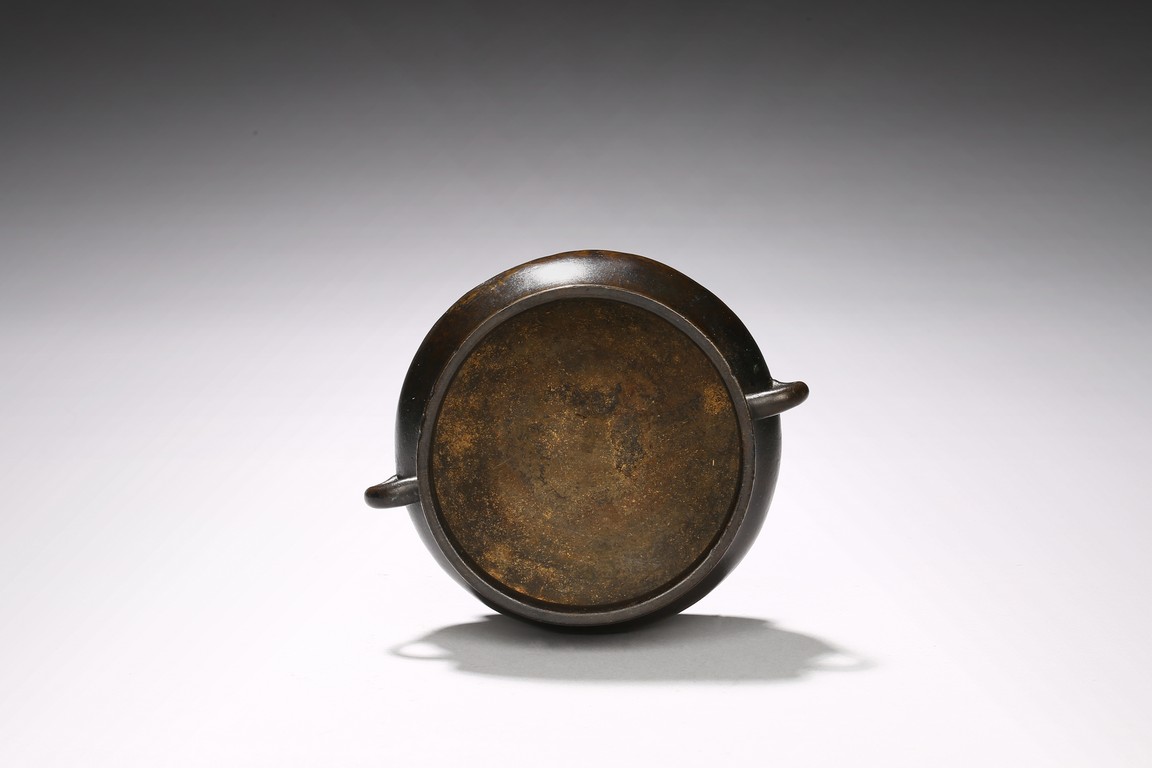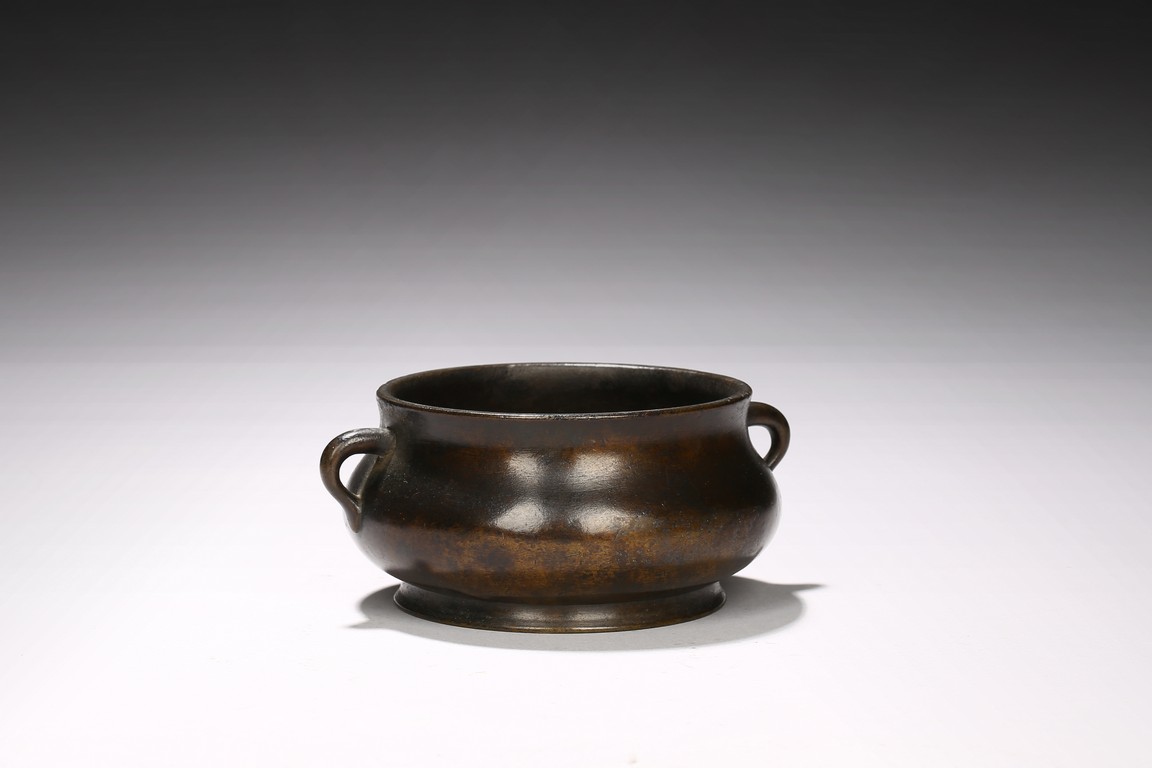 Qing Dynasty period.The compressed spherical sides rising from a slightly spreading foot to a flared rim, applied with two loop handles, the base with an apocryphal Xuande mark.