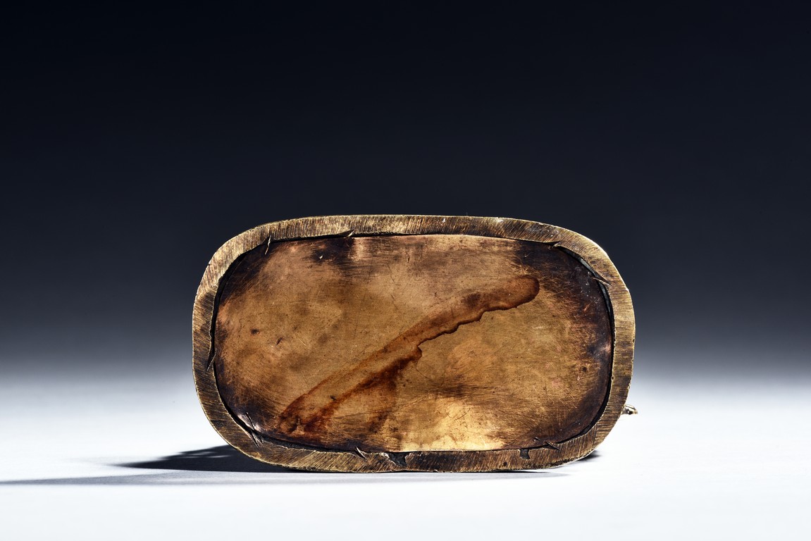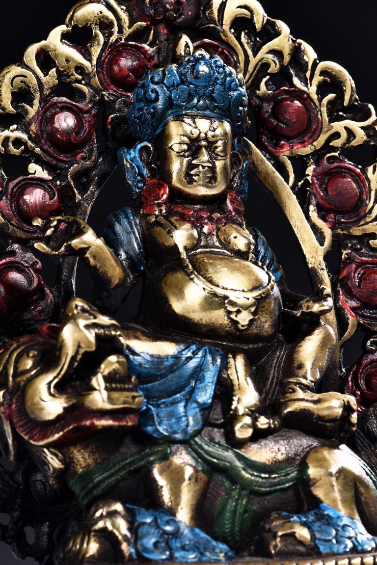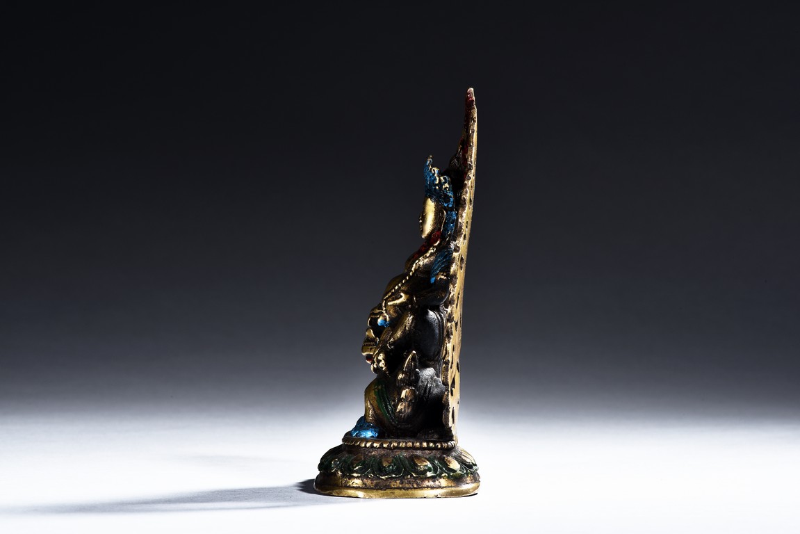 Set on a lotus throne and enamelled in red, green, and blue, the bodhisattva is shown standing upon a Buddhist lion, his large belly exposed, face with stern expression and wearing pointed crown, backed by a large throne back-slab.