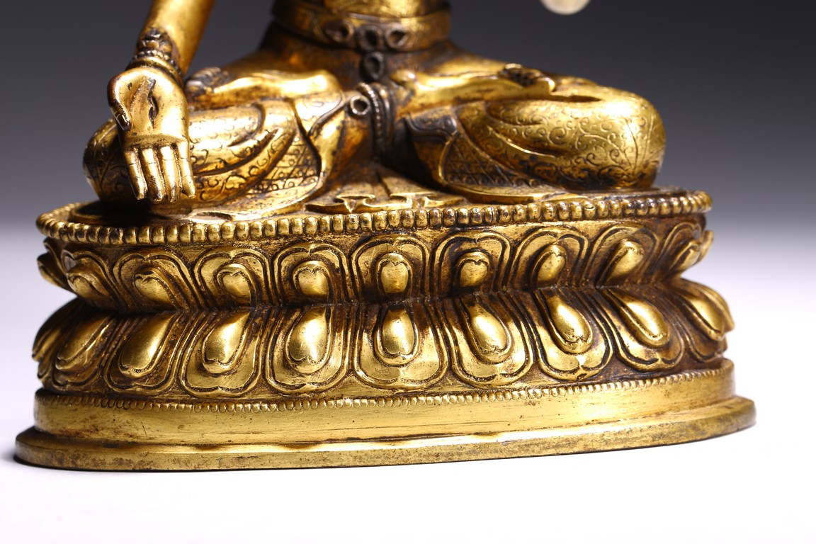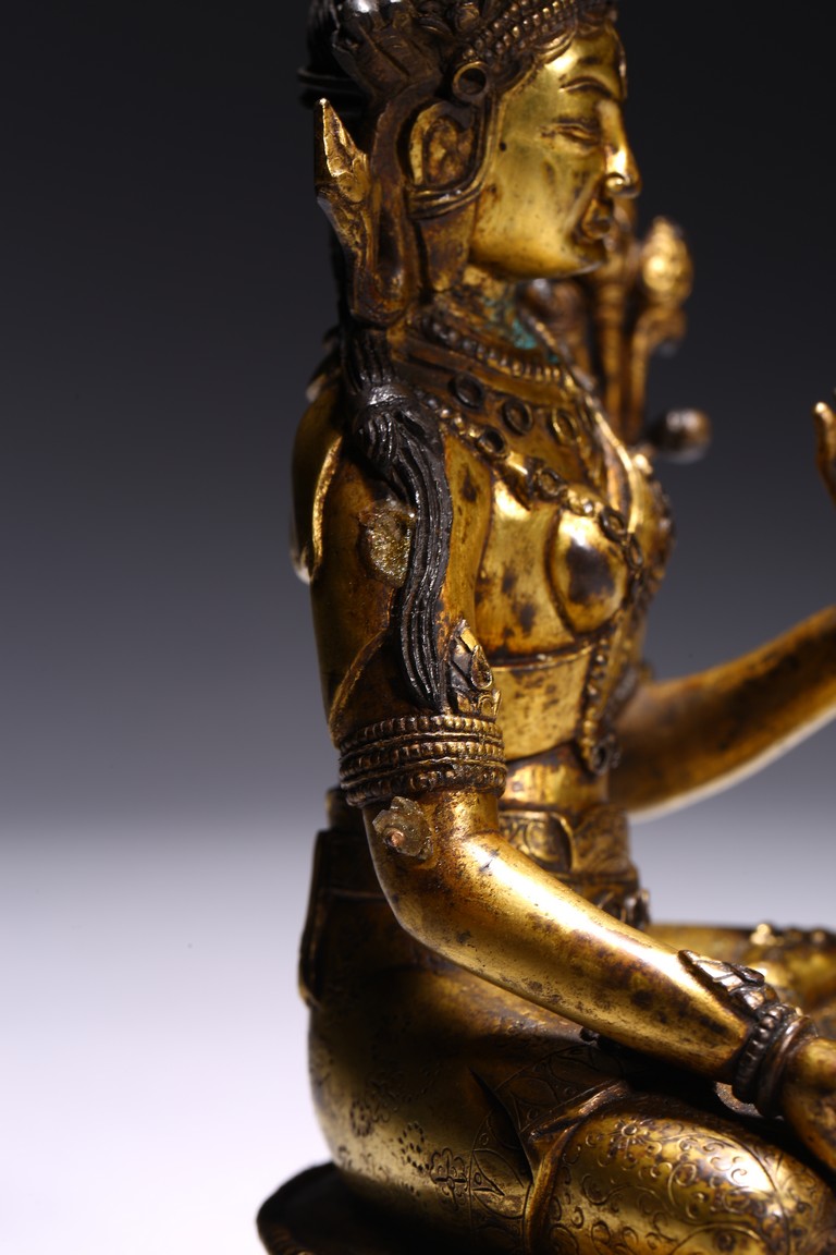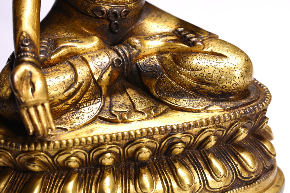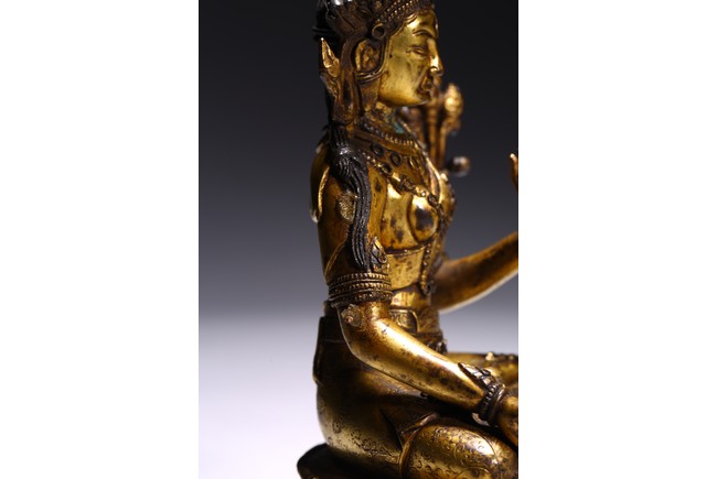 Shown seated in padmasana on double lotus throne, his right hand extended in varada mudra and the left is held in vitarka mudra, body adorned in beaded jewelry and hems incised with floral pattern. His face shown with meditative expression and surmounted with pointed tiara.