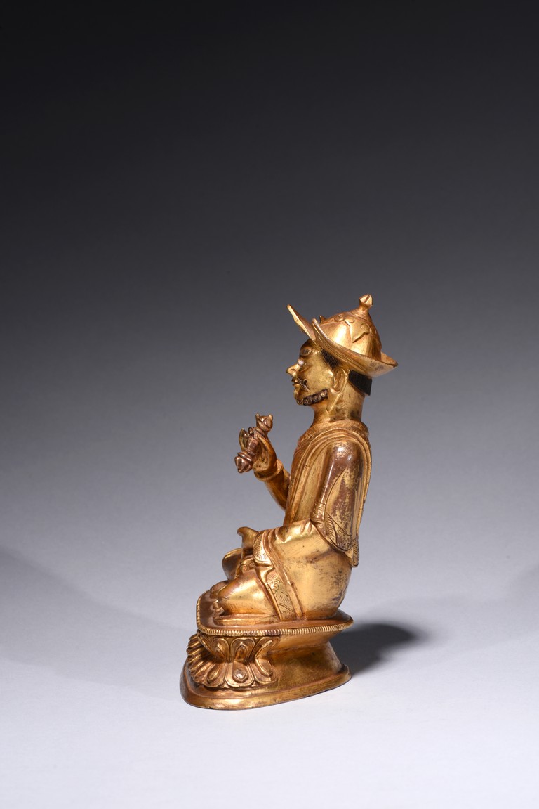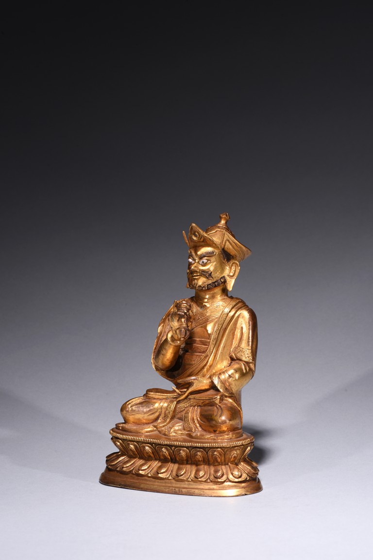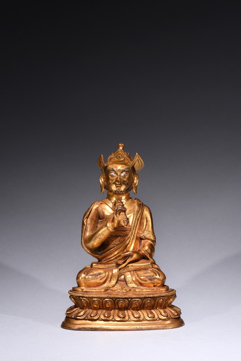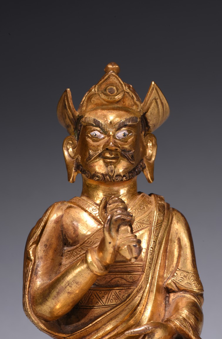 Qing Dynasty period. Shown seated in dhyanasana on a double lotus throne, right hand raised holding a vajra, wearing dhoti with incised hems, face with intense expression, wearing pointed hat, overall richly gilt.