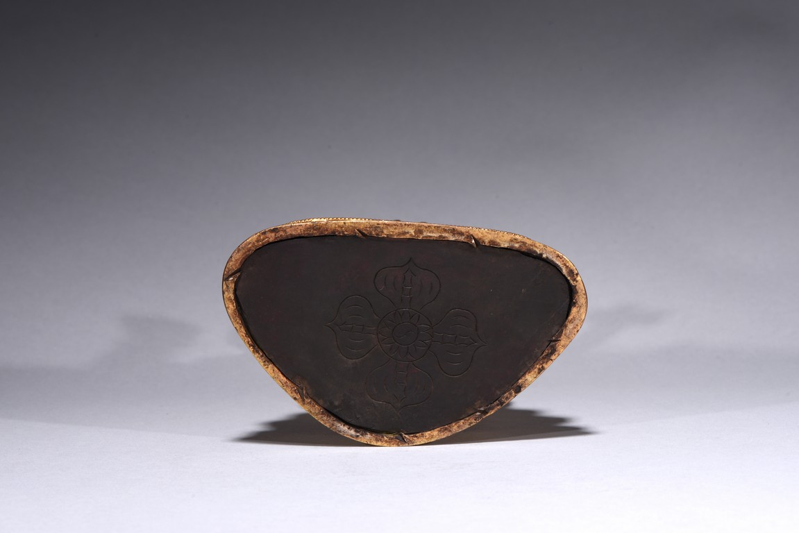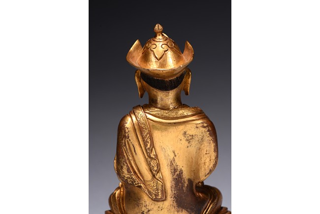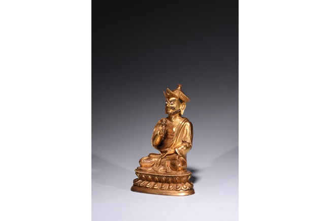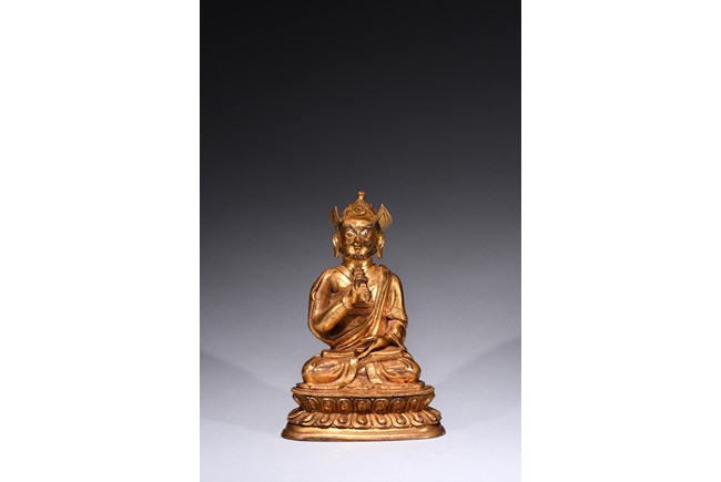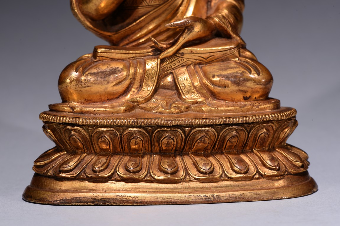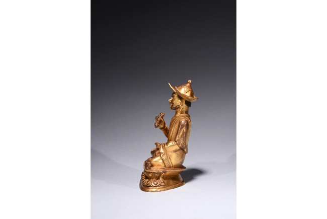 Qing Dynasty period. Shown seated in dhyanasana on a double lotus throne, right hand raised holding a vajra, wearing dhoti with incised hems, face with intense expression, wearing pointed hat, overall richly gilt.