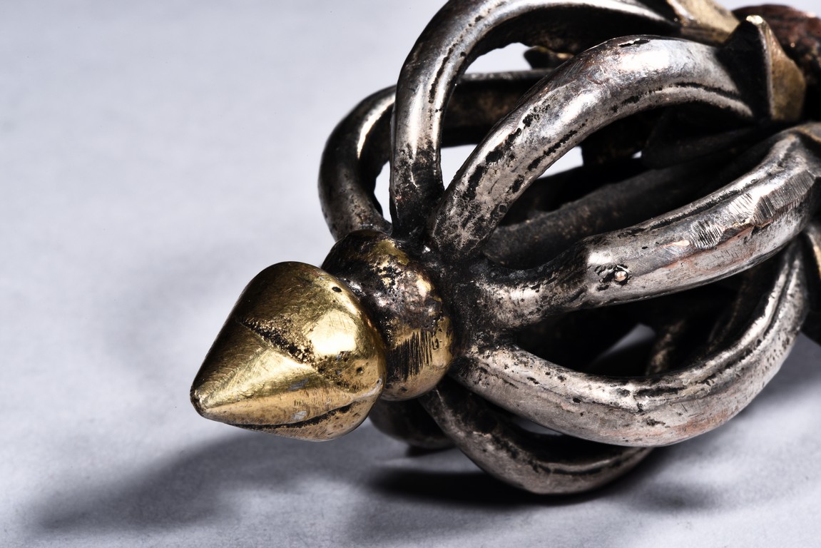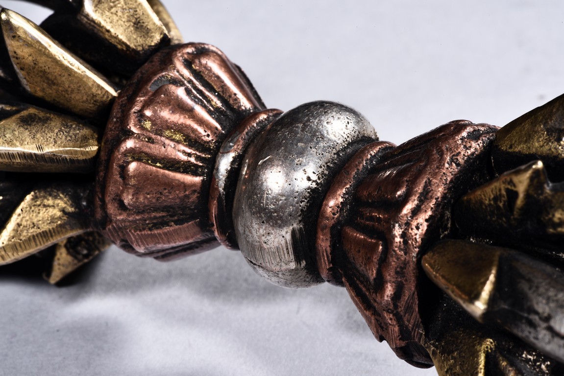 The rounded eight-pronged vajra with knob center finely cast in silver and copper alloy