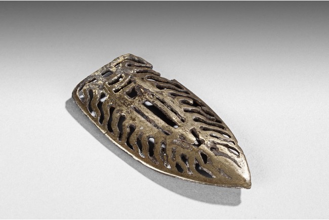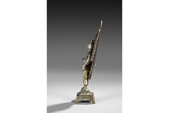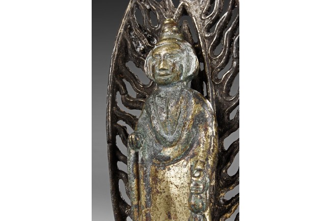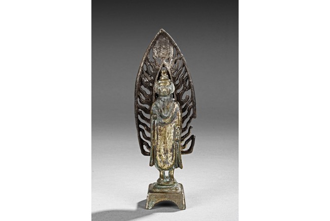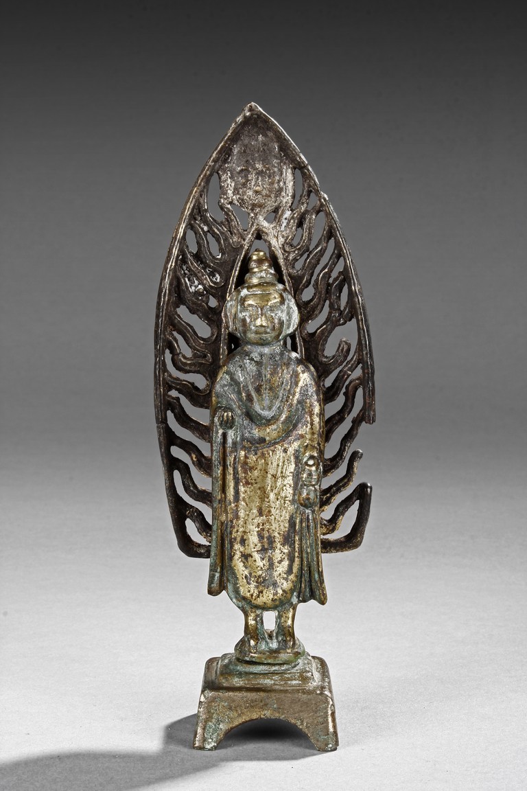 Possibly Northern Wei Dynasty period (386–535 AD). Depicting a deity adorned in long flowing robe, standing before reticulated flame shape mandorla above square form support all raised on four legged plinth.