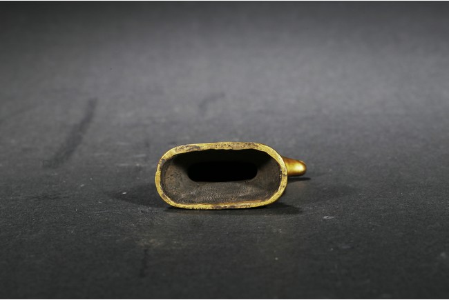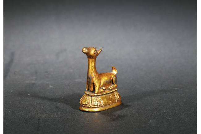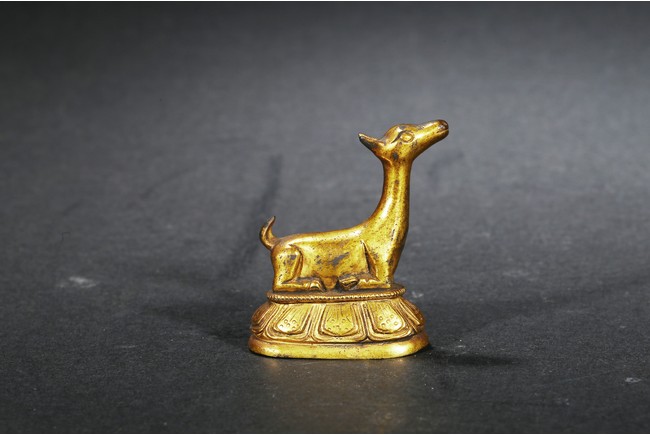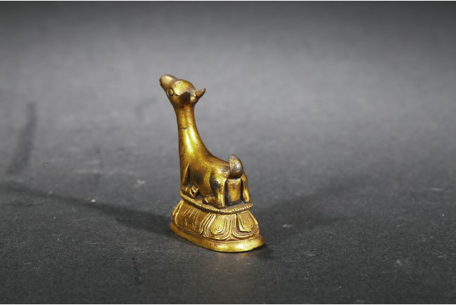 Cast in the form of a recumbent deer seated upon lotus throne.