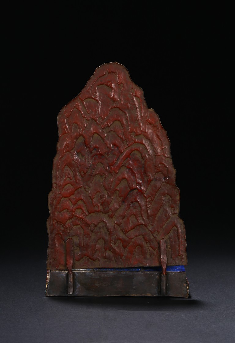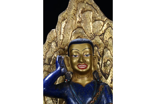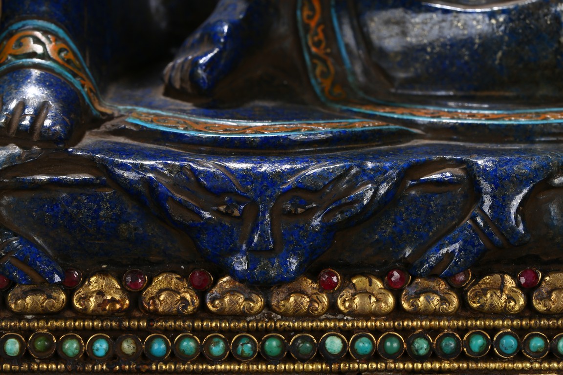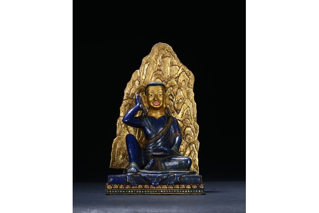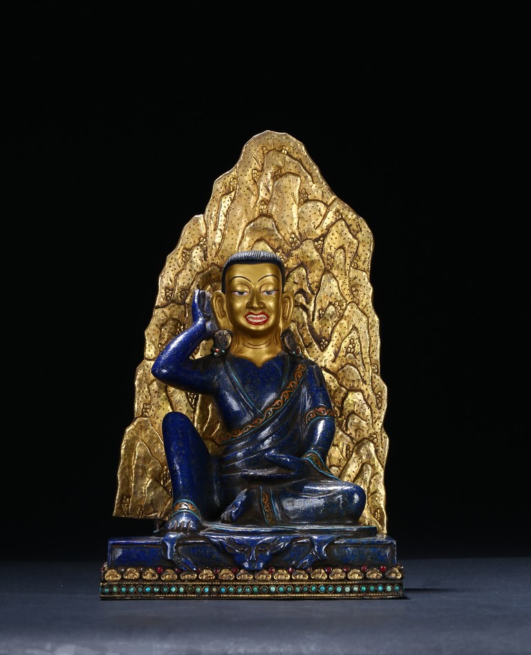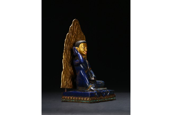 Seated in lalitasana on an antelope skin, atop a double plinth incised with foliate motif, heavy jeweled earrings and long black tresses cascading down the back, the right hand raised to the ear, the left hand in samadhi mudra, the upper and lower robes incised with decorative patterning at the hems.
