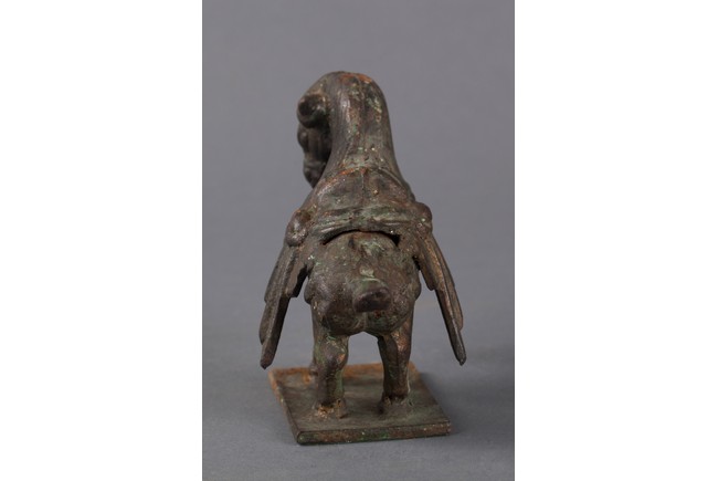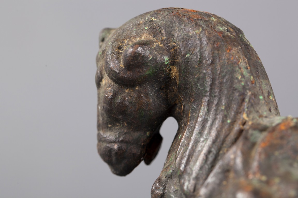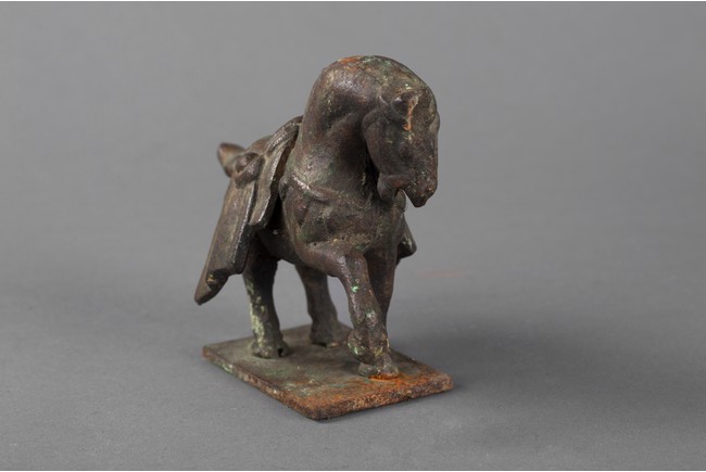 The bronze figure depicts a horse raising his front right hoof high in the air, ready to gallop forward.