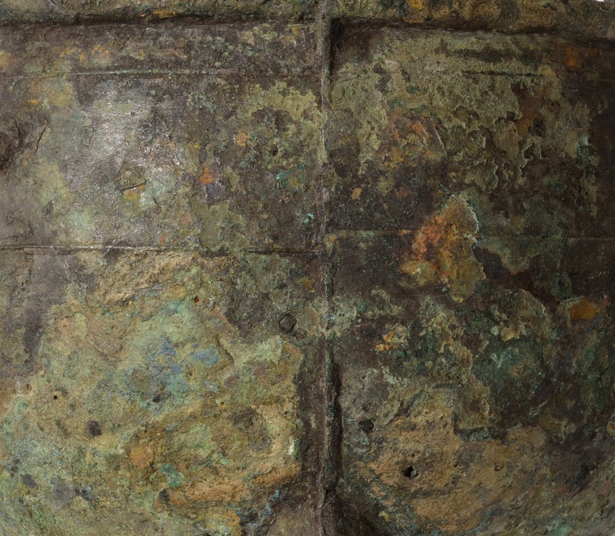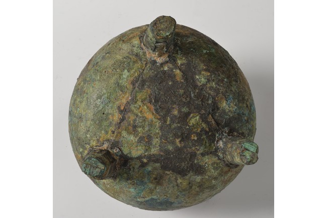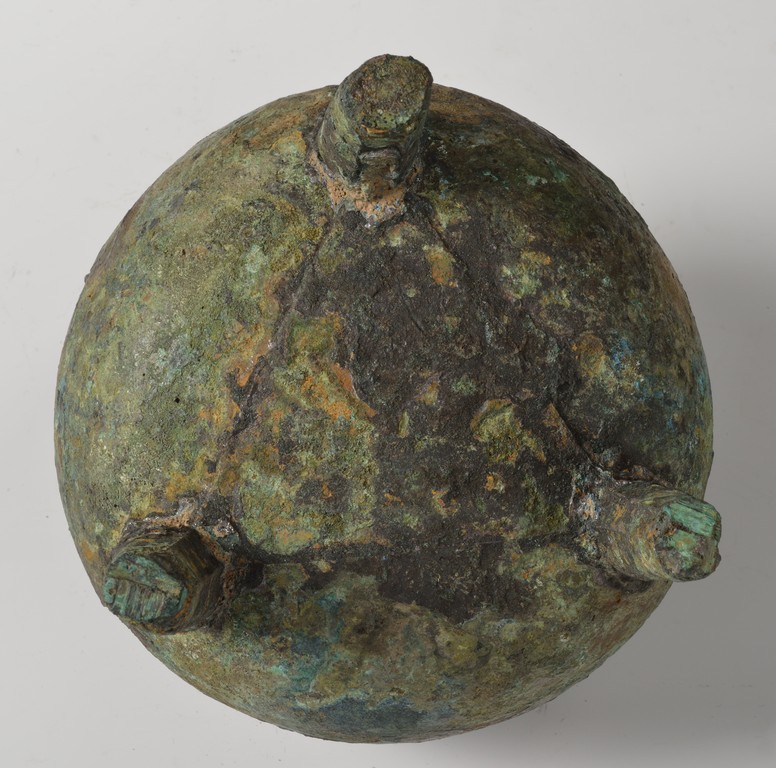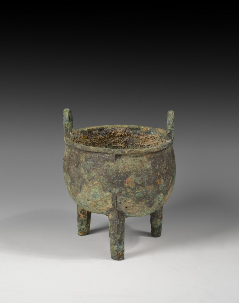 Western Zhou Dynasty (c. 1045 – 771 BC) or later. Decorated with band of taotie mask around the body, mouth rim supported with two upright arched handles, all supported on three feet.