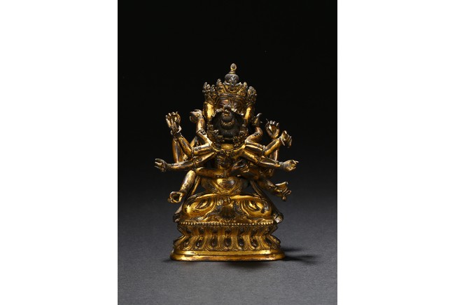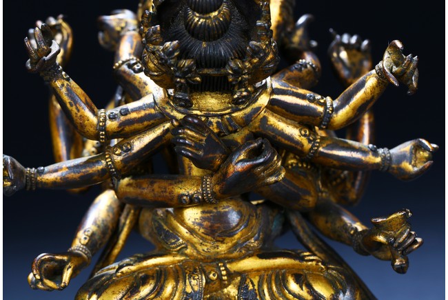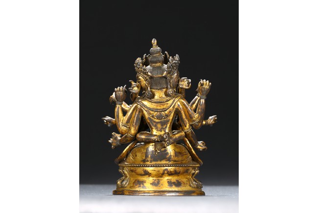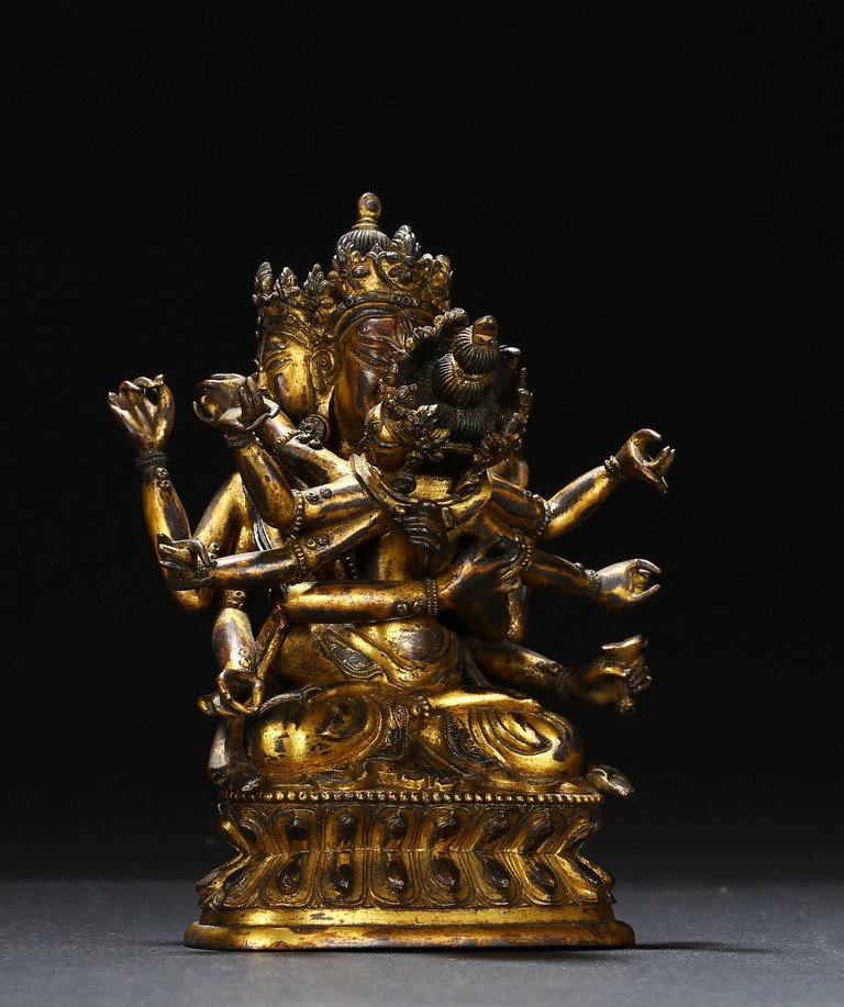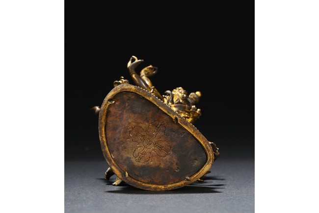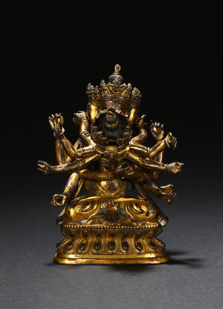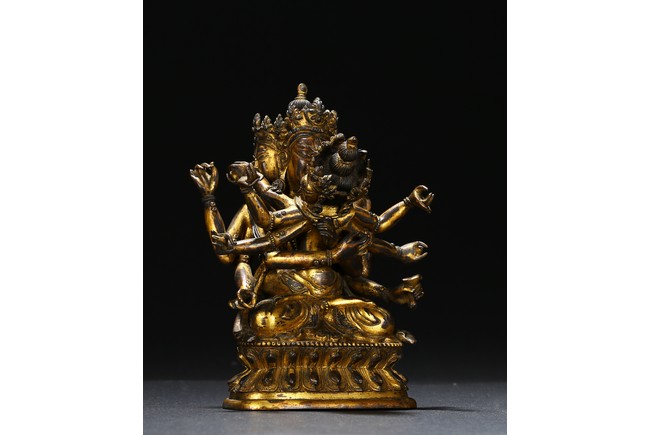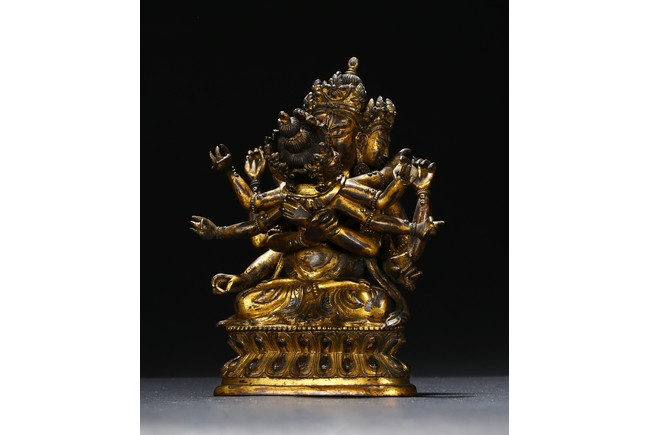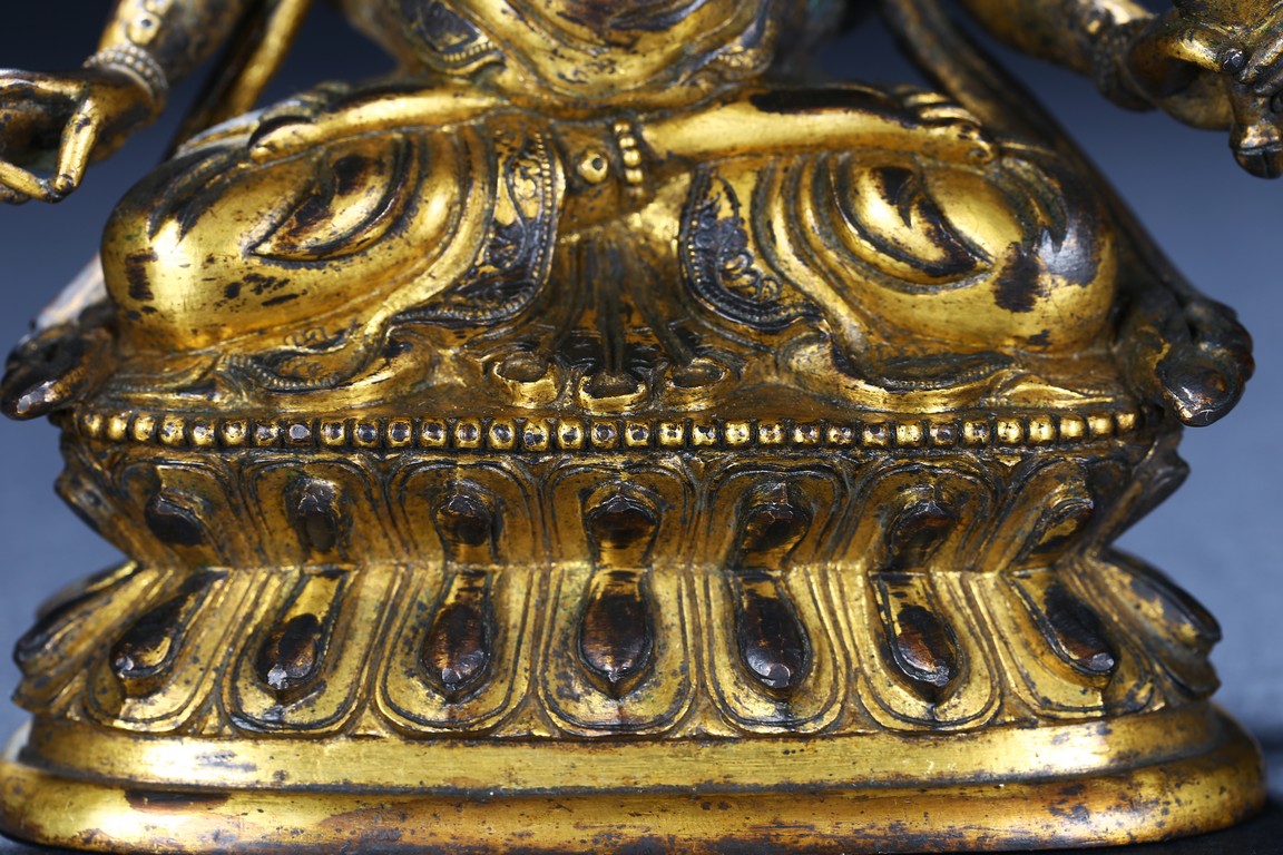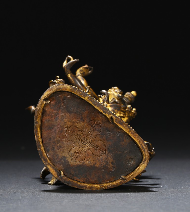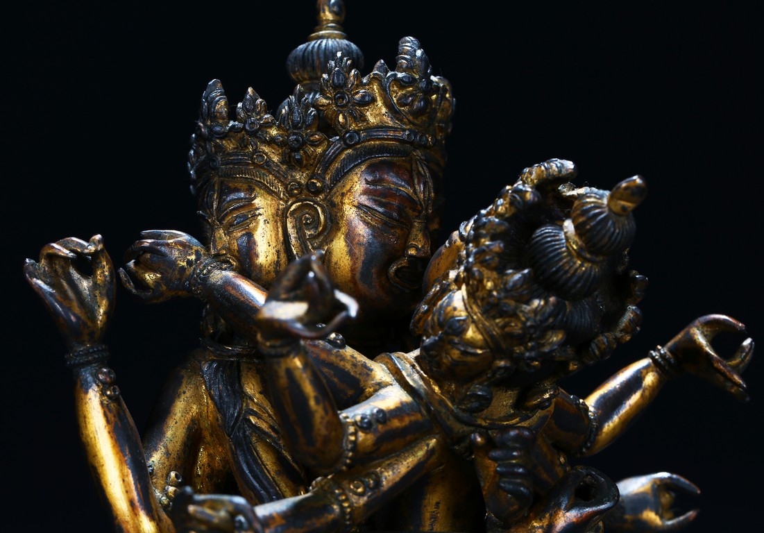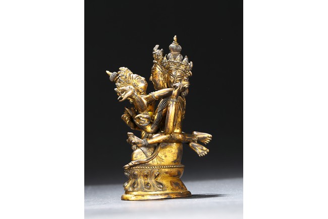 18th C.Guhyasamaja seated on a lotus base embracing his consort and holding the vajra and ghanta in his principal hands, both wearing long dhotis with finely incised floral scrolls and beaded festoons, the base sealed.