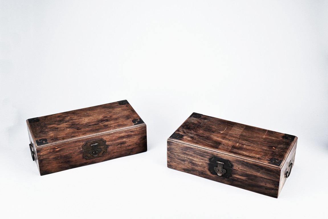 Each of rectangle shape, the top with ruyi shaped corner mounts, the side with bail handles, the front fitted with lockplate and ruyi shaped hasp.
