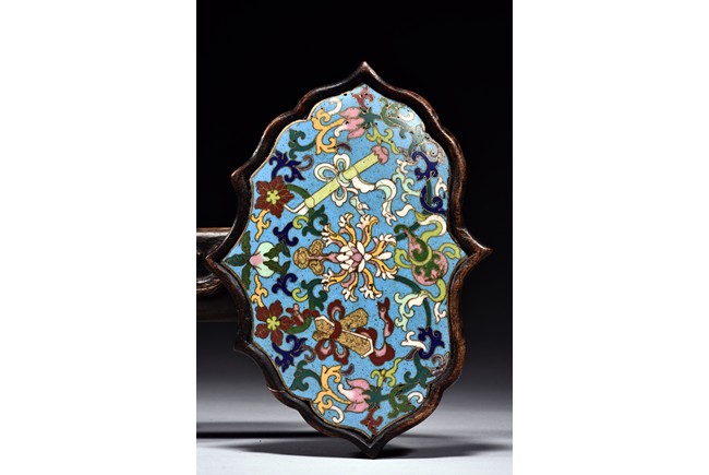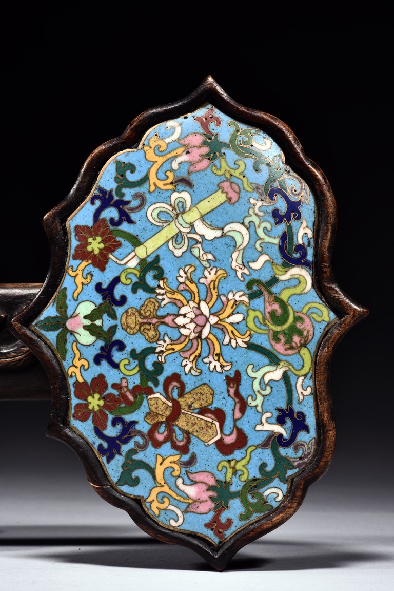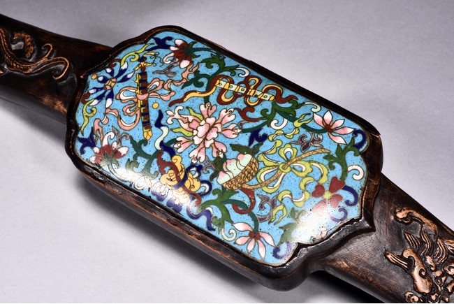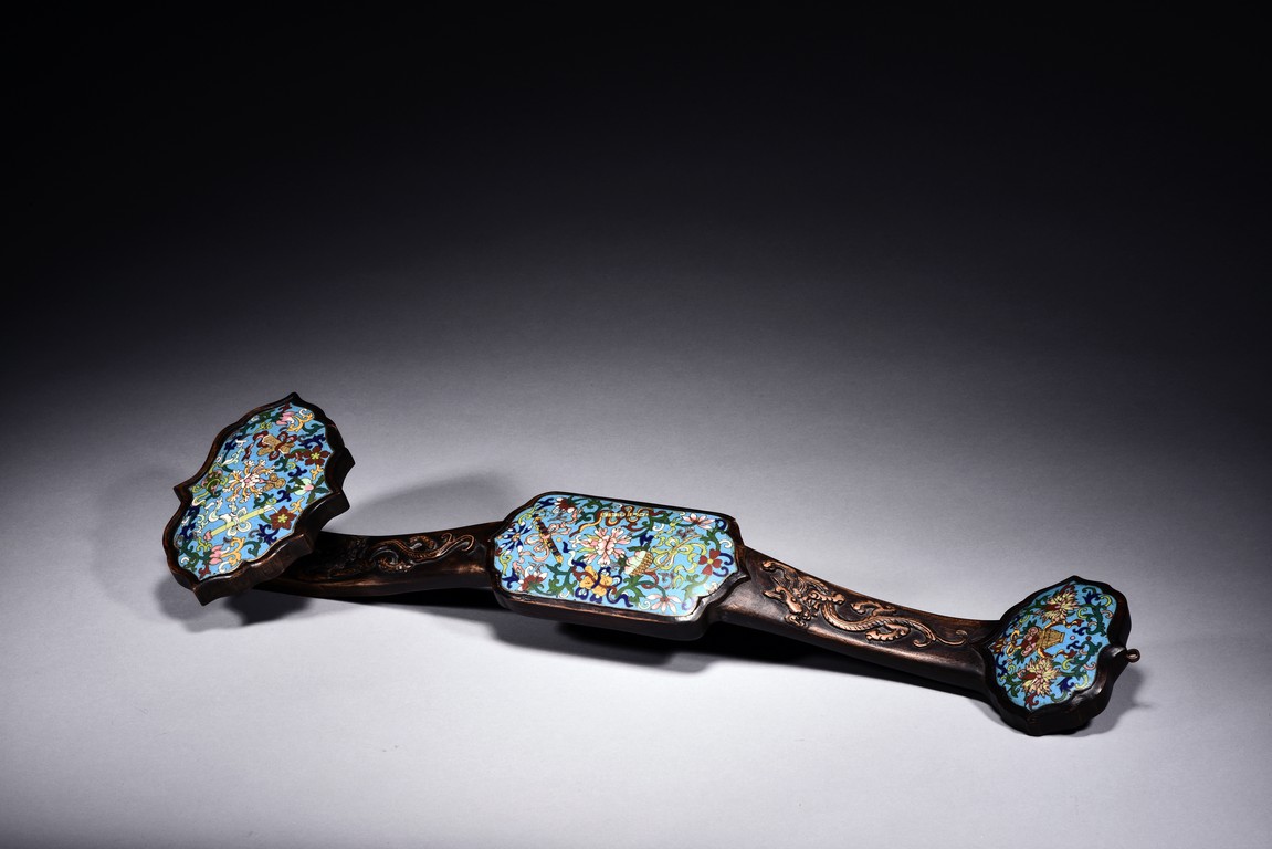 A HARDWOOD RUYI SCEPTER INSET WITH CLOISONNE ENAMEL 清 紅木嵌景泰藍如意