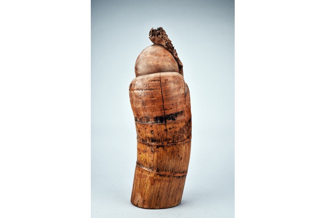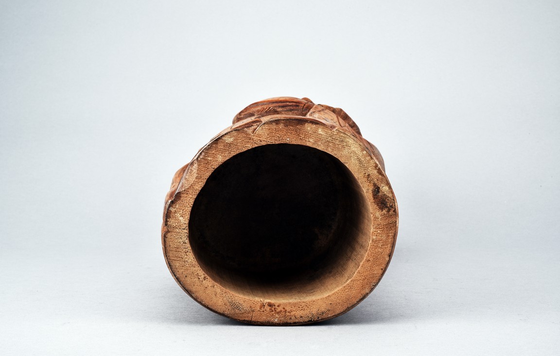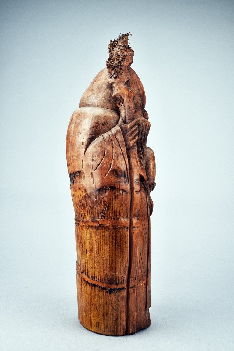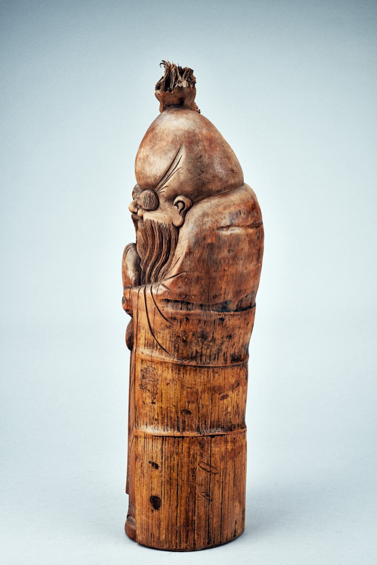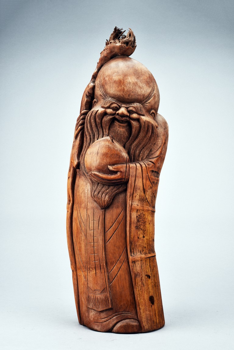 The smiling god of longevity carved standing, with characteristic protruding forehead, framed by long and finely combed beard, dressed in flowing robe, holding a staff in right hand and peach in left hand.