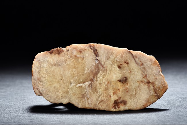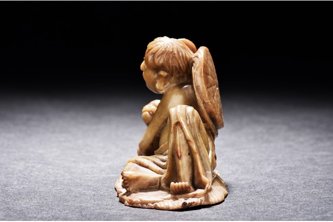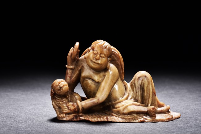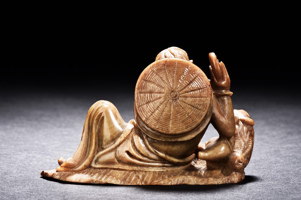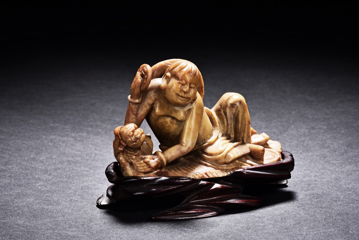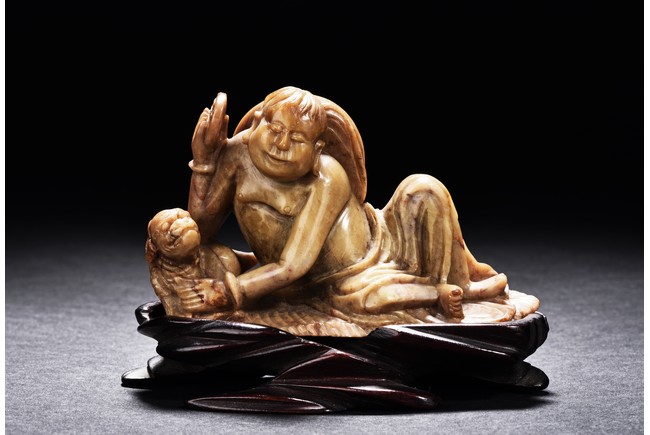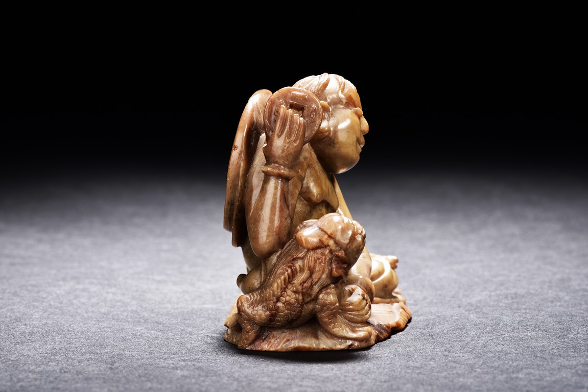 The carved Liu hai is shown holding a coin playing with a Buddhist lion. The stone is of opaque mottled beige tone.