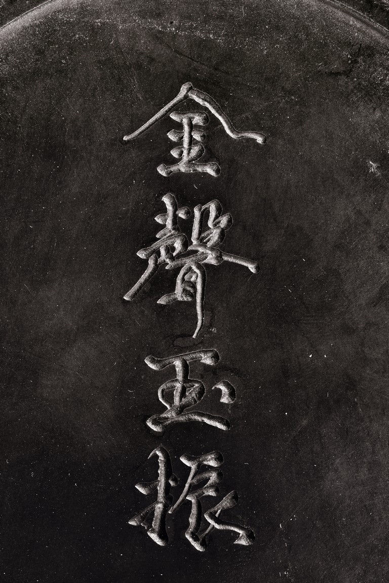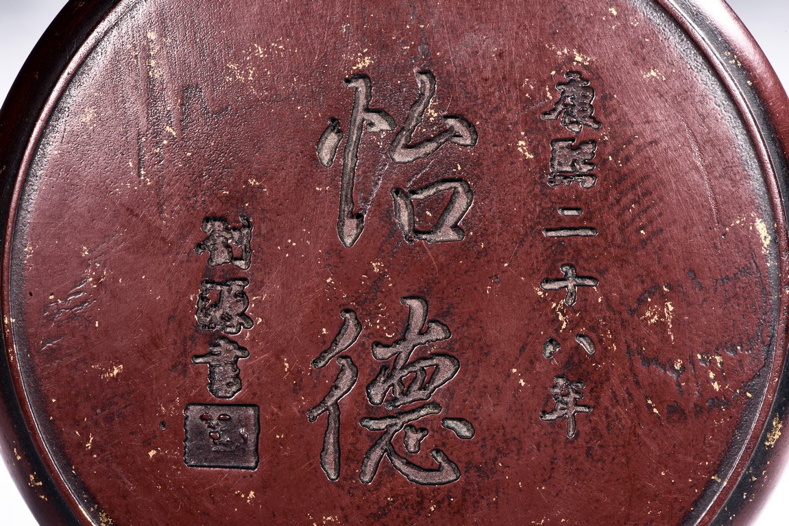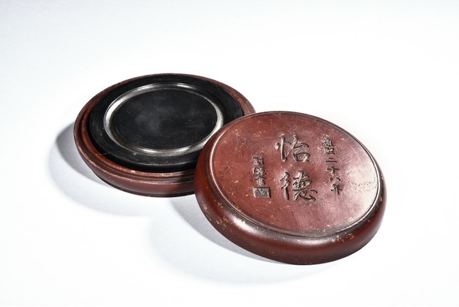 Of circular shape, the inkstone with four character inscription. Accompanied with a case with inscription.