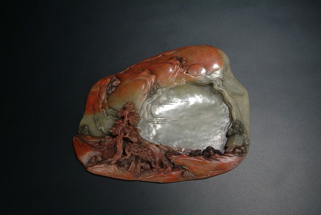 Republic period. A delicate brush washer carved in relief depicting a mountainous scene, comprising two elders under a pine tree leisurely taking a walk towards a small cottage on the far right. The stone's darker tones were cleverly utilized to emphasize the subjects.