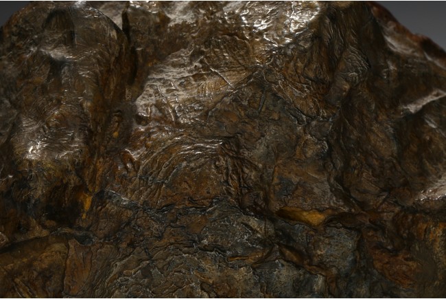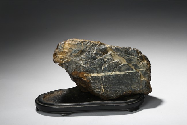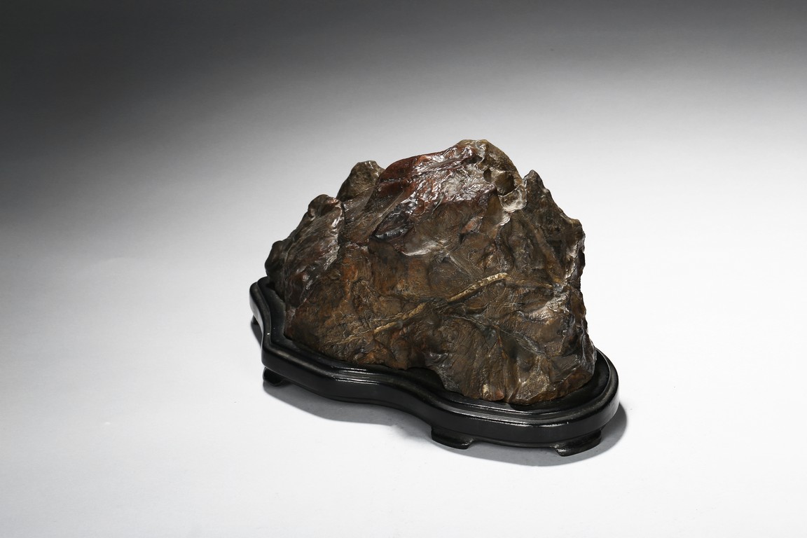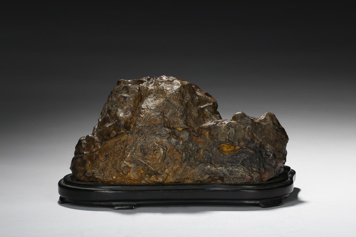 The horizontal stone with pointed ridges resembling a craggy mountain, the surface with natural calcite striation, all fitted on wood stand.