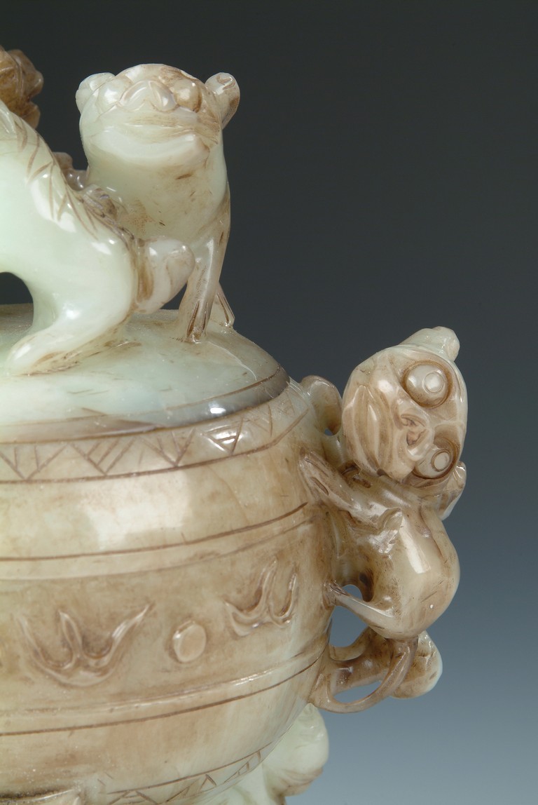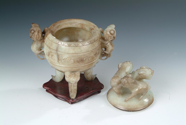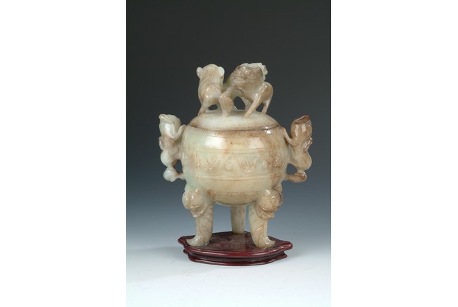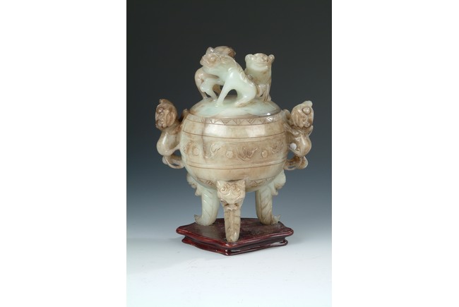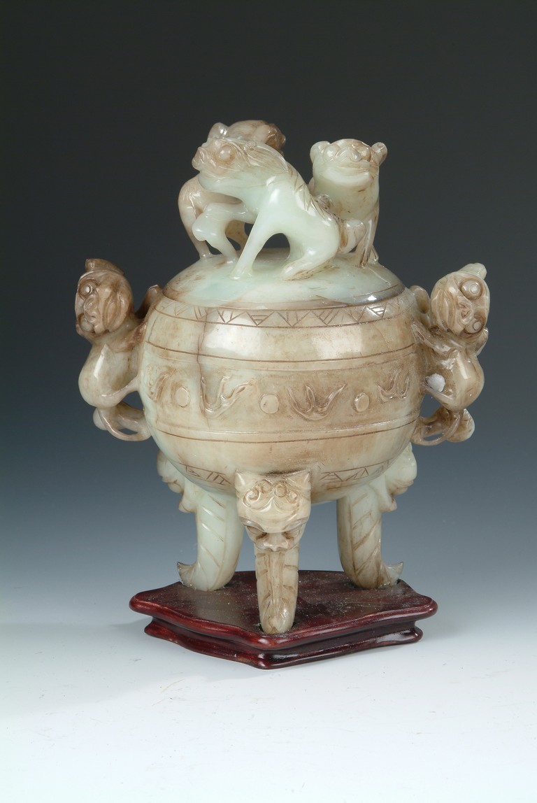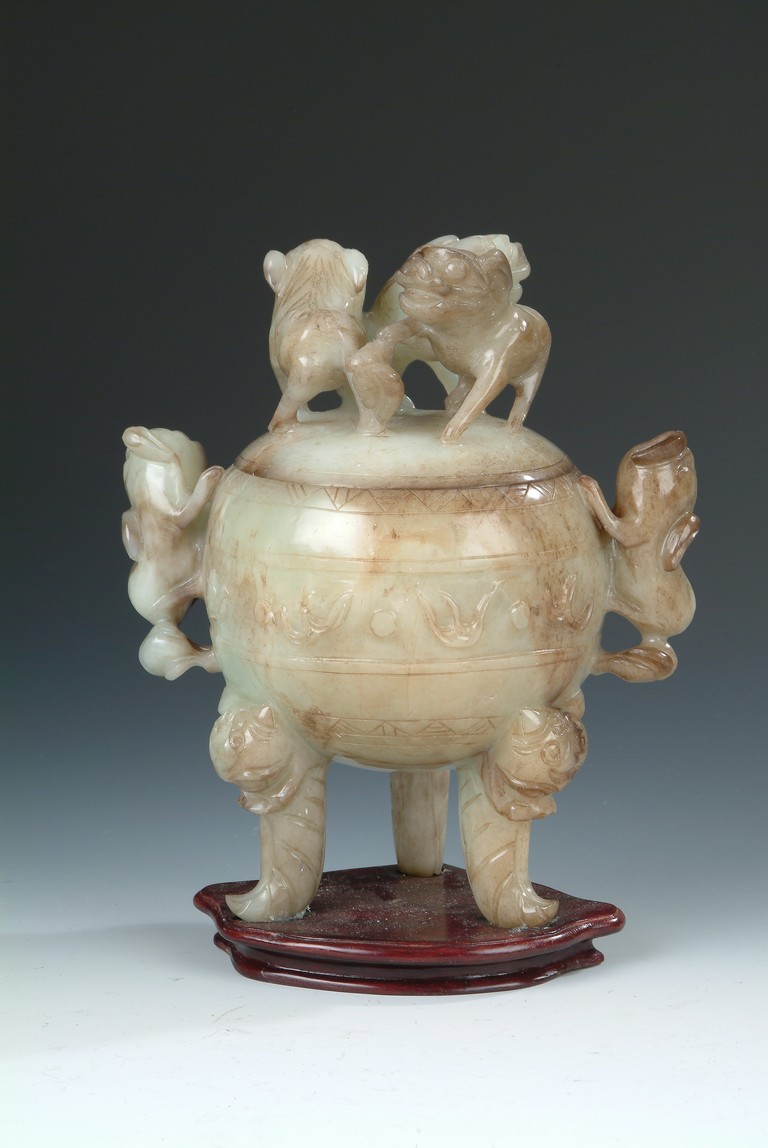 Of globular shape, stands on three long legs extended from beast masks, a pair of mythical beast form handles on the side, body carved with scrolling patterns, and three mythical beasts acting as finial on the cover.