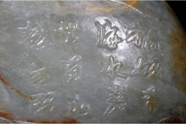 Qing Dynasty period. Of irregular mountain boulder form, on one side finely carved with poem inscription in stylized character beneath the curved blossoming flowers pattern, on the left bottom part with large patches of reddish-russet inclusion, the reverse side carved in relief with an official talking with a child in a mountain setting, the stone is of translucent white tone with yellowish-russet inclusion.