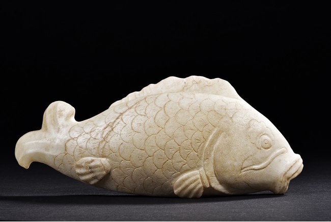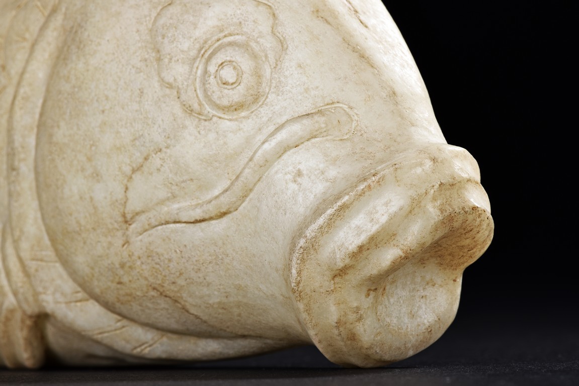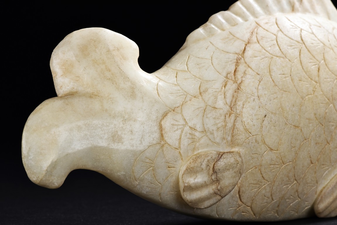 Qing Dynasty period. The jade is modelled as a fish flicking its tail slightly upwards, the body finely incised to represent scales.