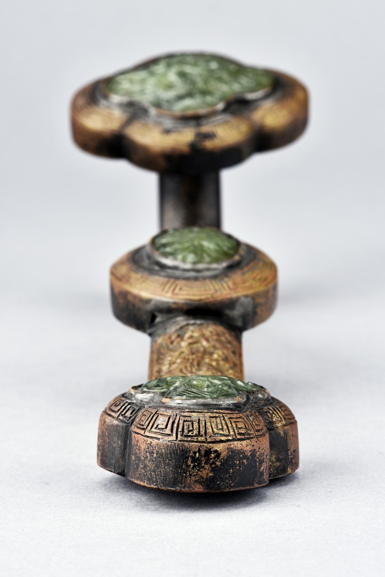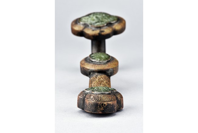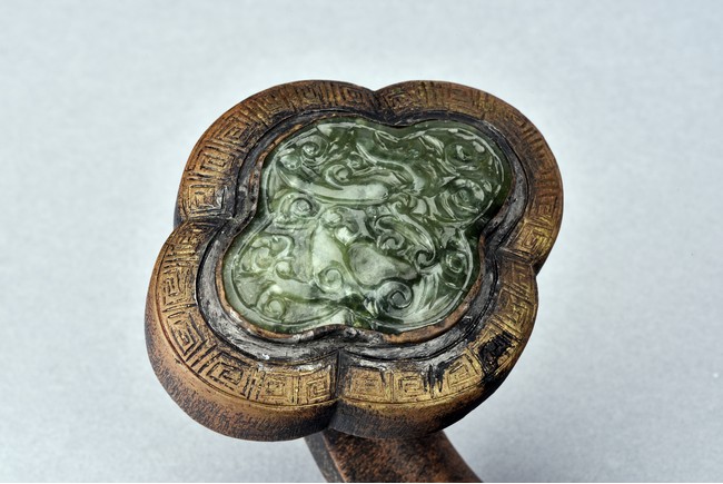 The quatrefoil ruyi head containing a spinach jade plaque of spinach jade, depicting scrolling foliage, framed in a border of key-fret pattern. The shaft having a phoenix design and embellished with ovoid spinach jade plaque, and the end of the scepter inset with spinach jade of similar floral design.