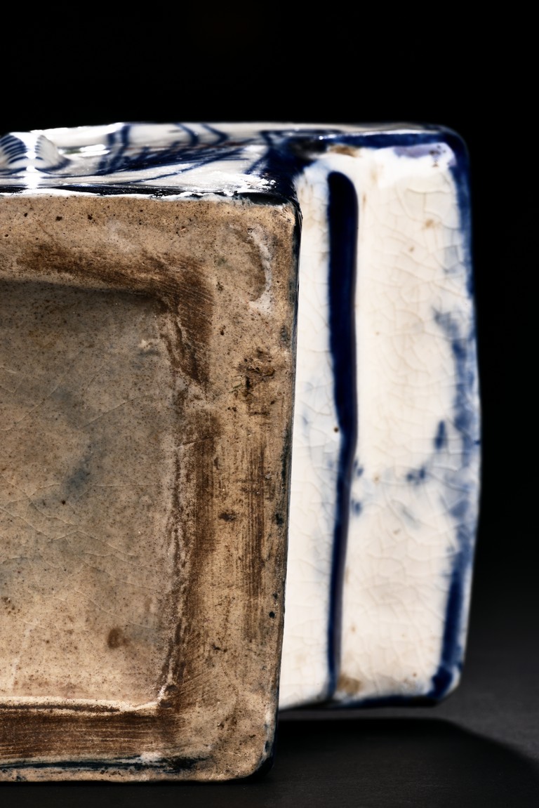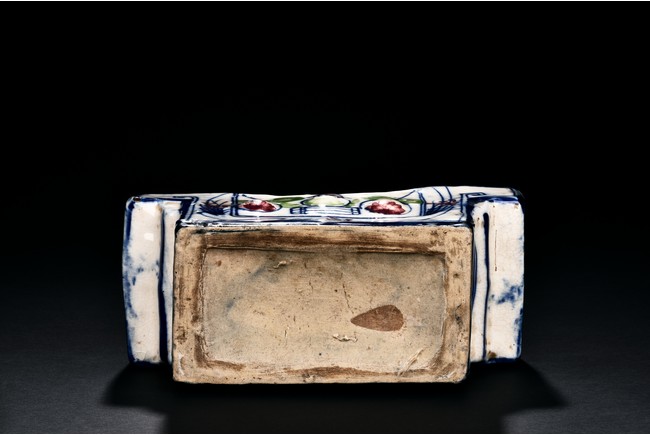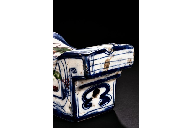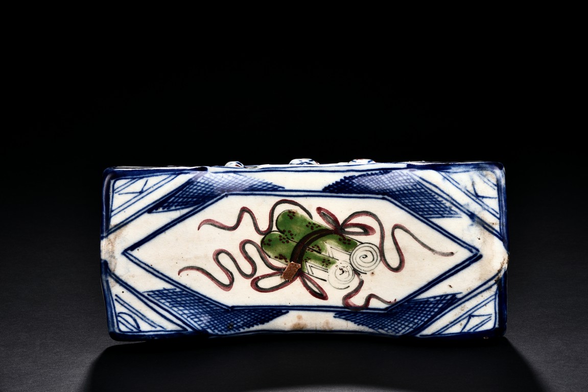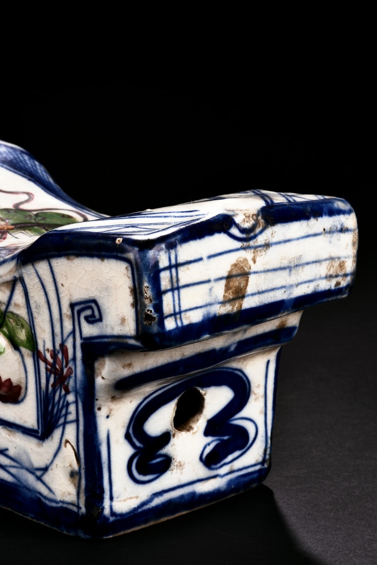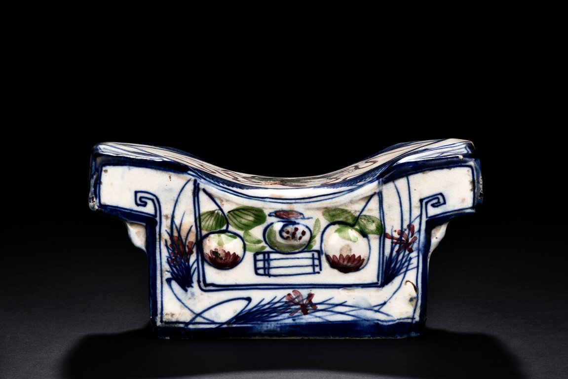 Qing Dynasty period. Of rectangle section, the pillow decorated with orchids and flowers in polychrome.
