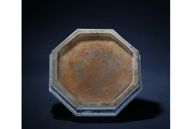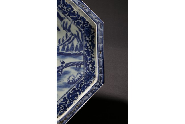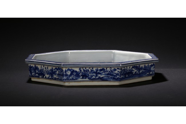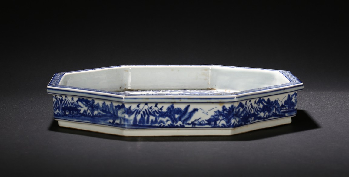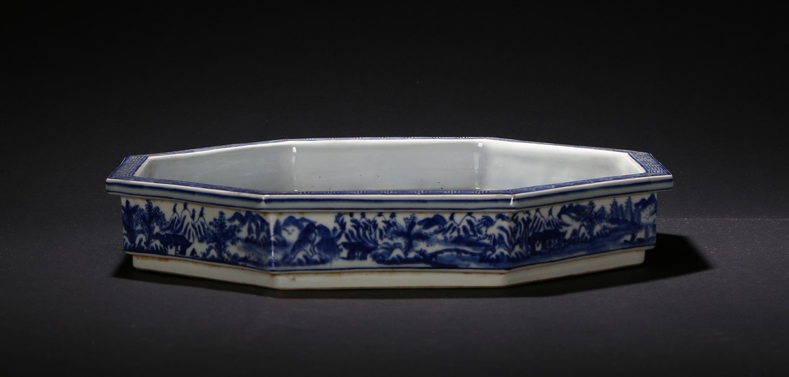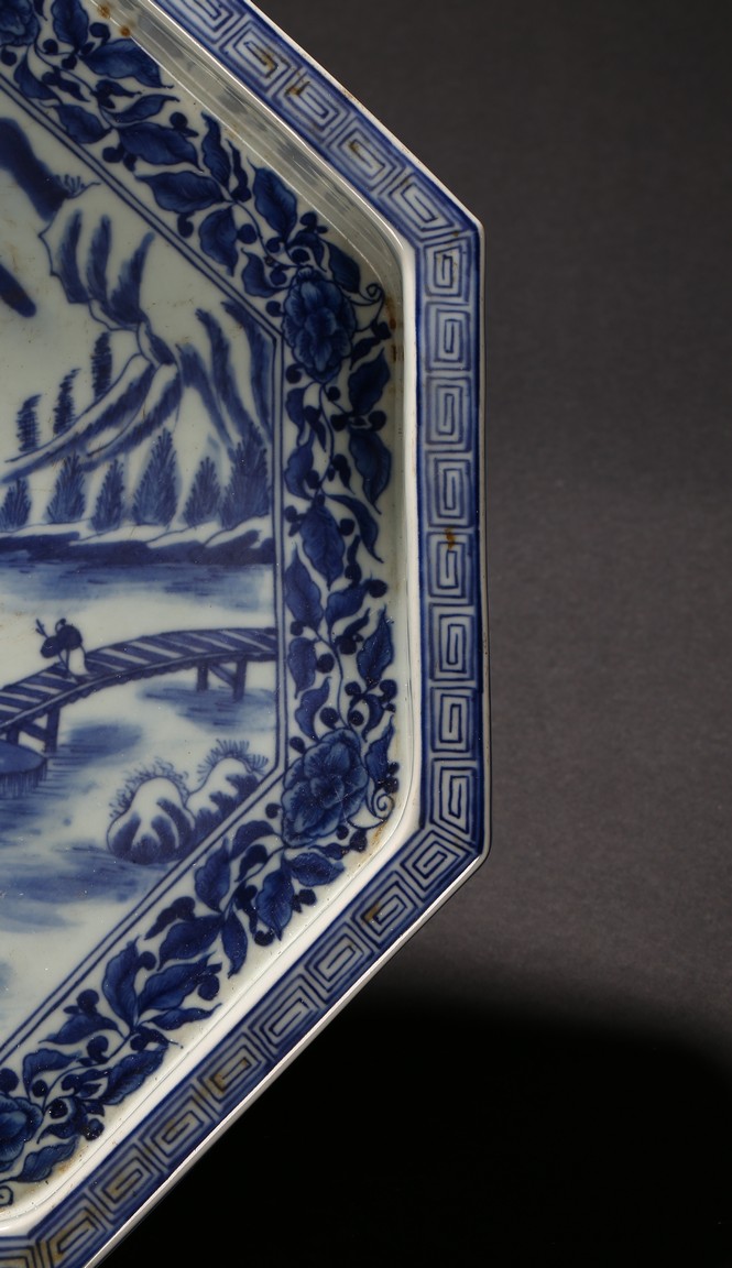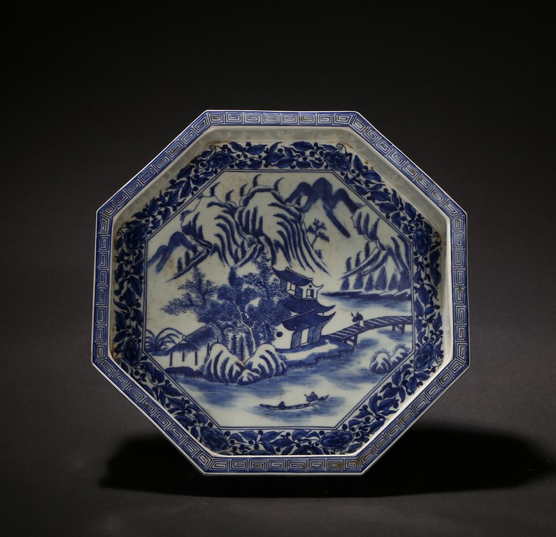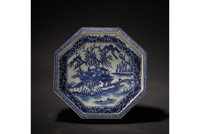 A BLUE AND WHITE OCTAGONAL DISH 青花山水八邊盤