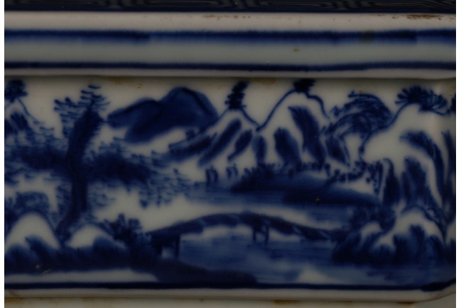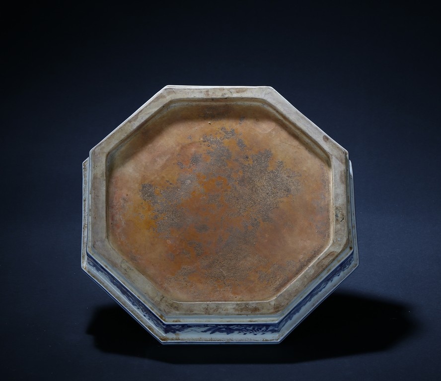 Of octagonal form, the interior painted in vivid blue to depict a riverscape scene.