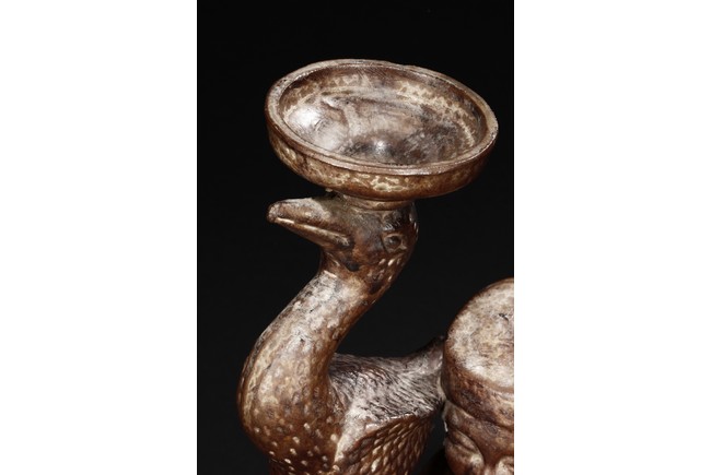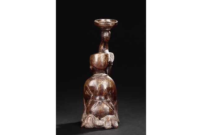 A ceramic figure and crane candleholder