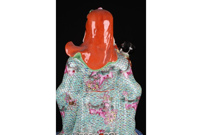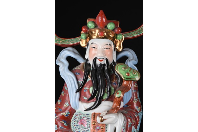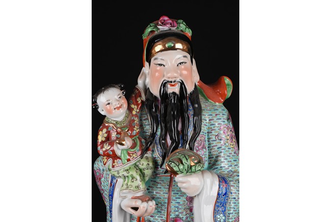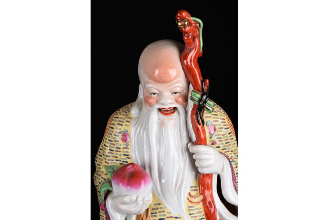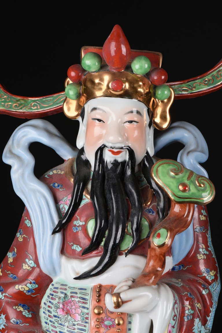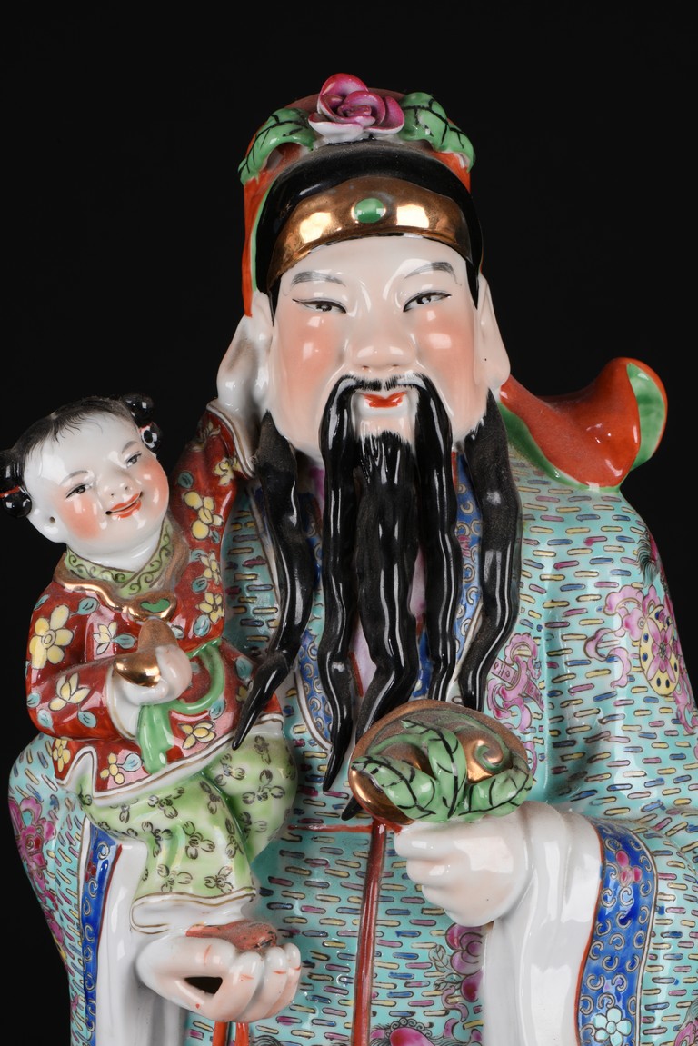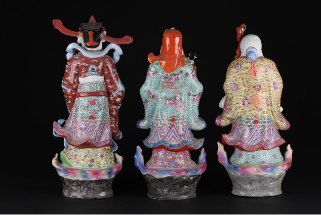 20th C. The set comprises of three large standing figures, fu, lu, and shou, each representing prosperity, status and longevity, each wearing colorful floral pattern long robe with elegant folds, each with long beard and holding longevity peach, lingzhi ruyi scepter or lucky girl in their hands.