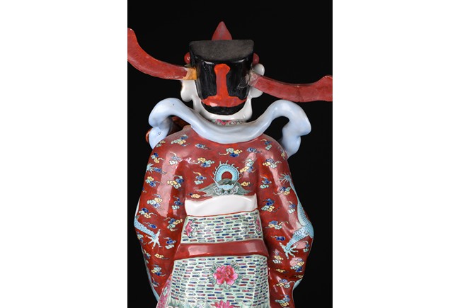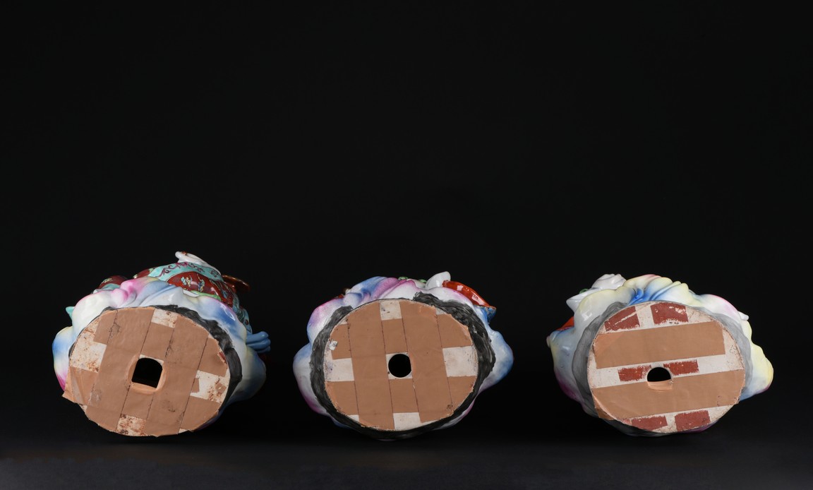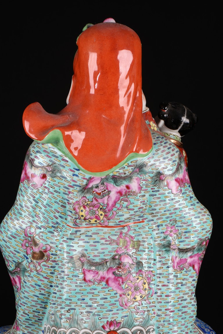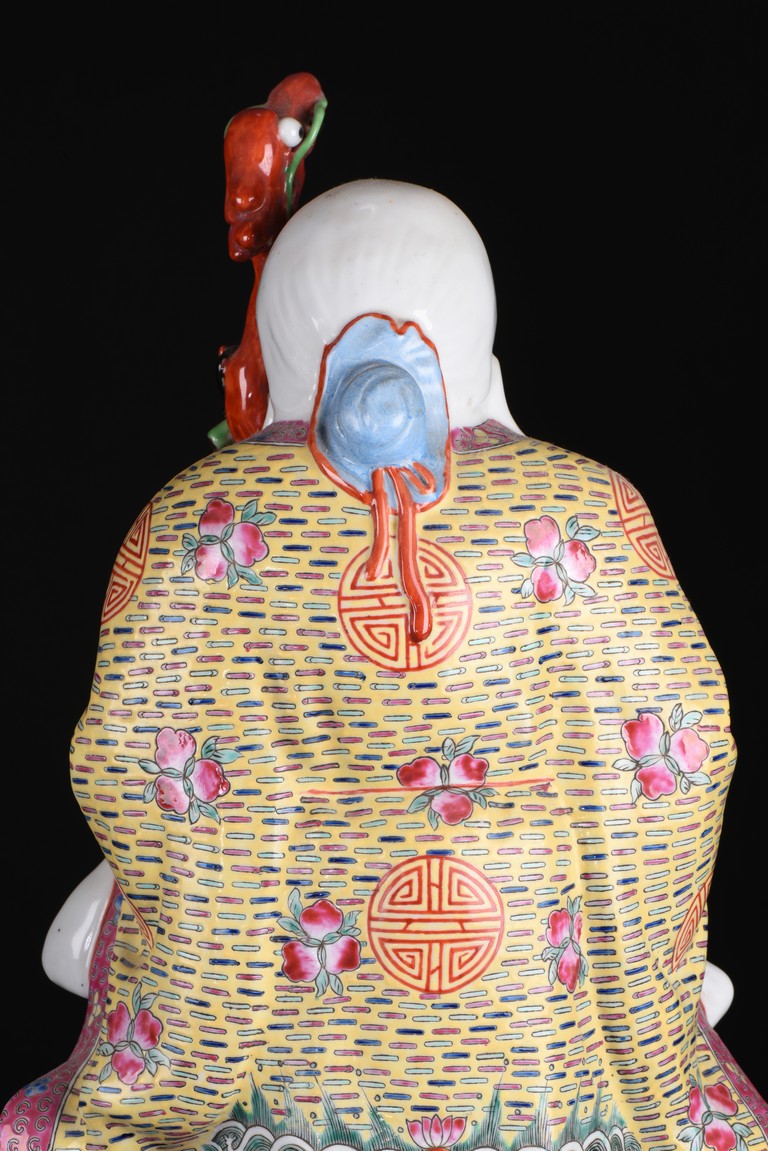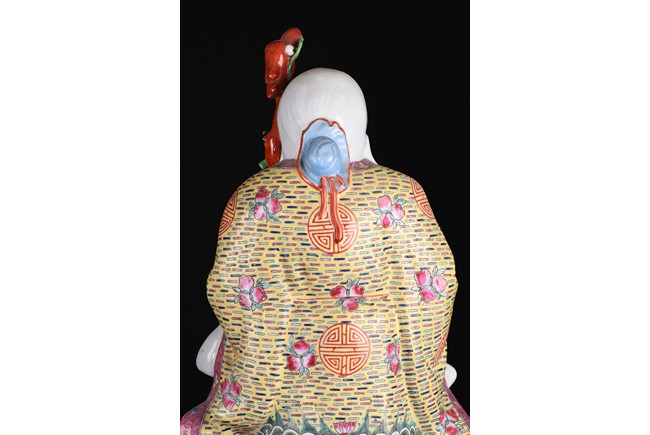 20th C. The set comprises of three large standing figures, fu, lu, and shou, each representing prosperity, status and longevity, each wearing colorful floral pattern long robe with elegant folds, each with long beard and holding longevity peach, lingzhi ruyi scepter or lucky girl in their hands.