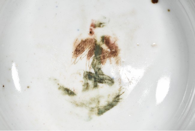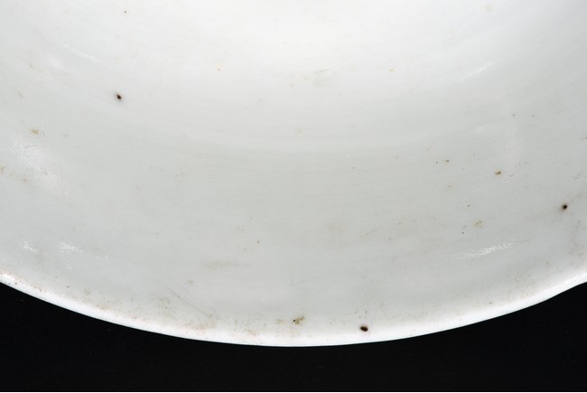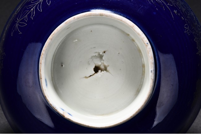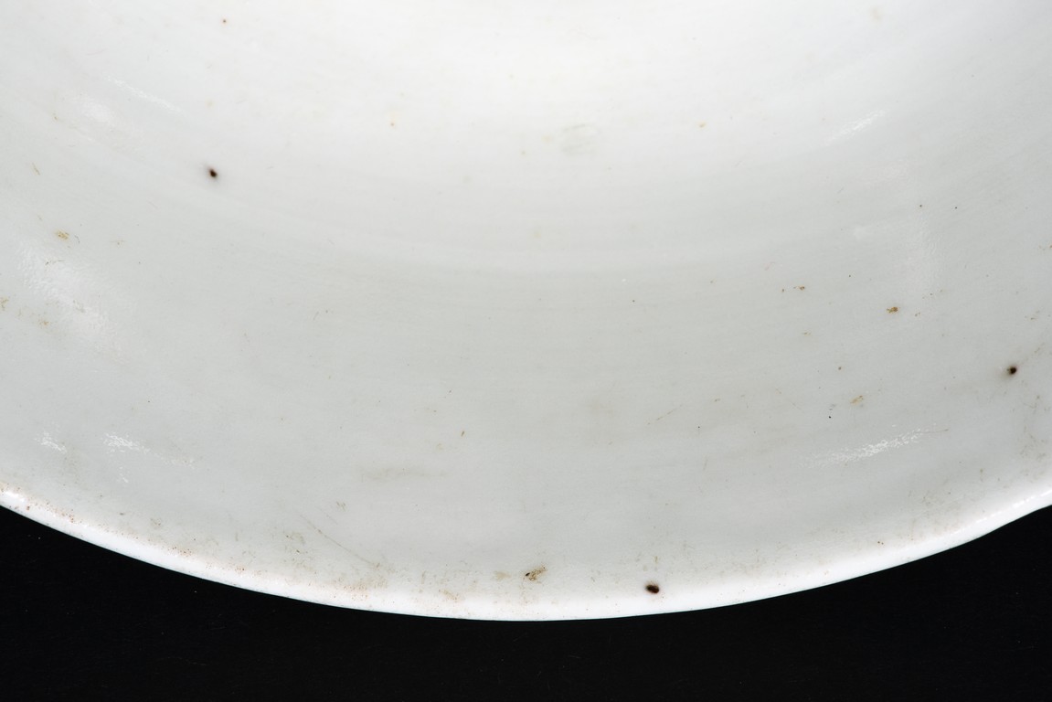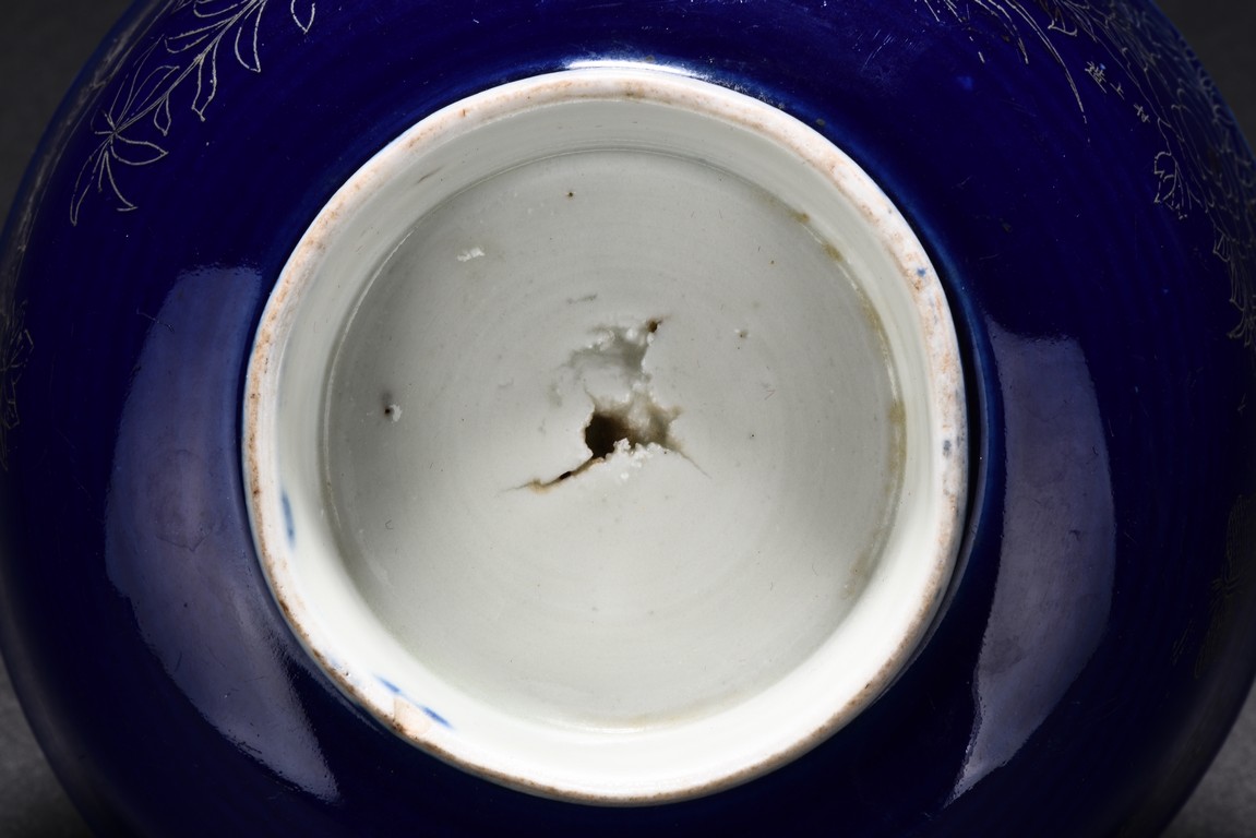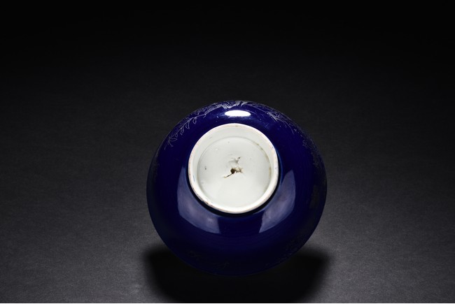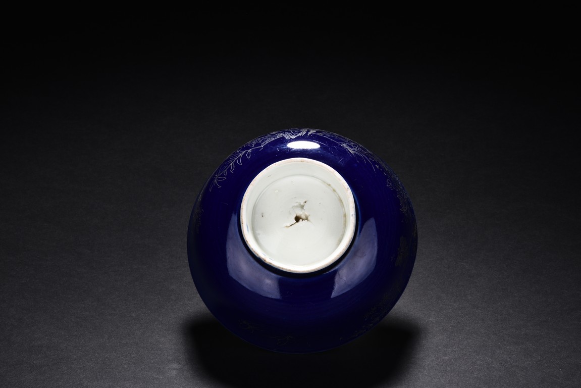Body incised to depict leafy flowers on blue glaze ground, the interio covered r in white glaze.