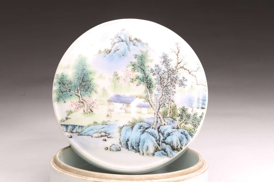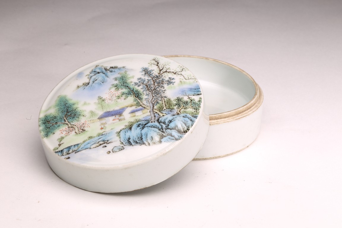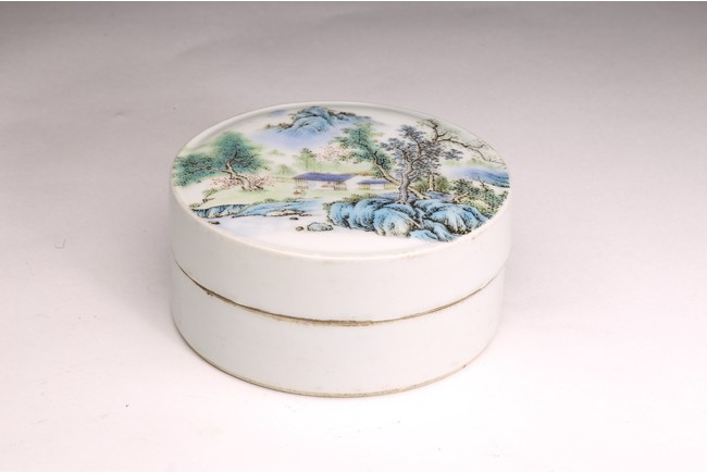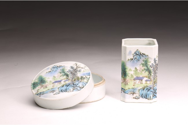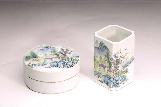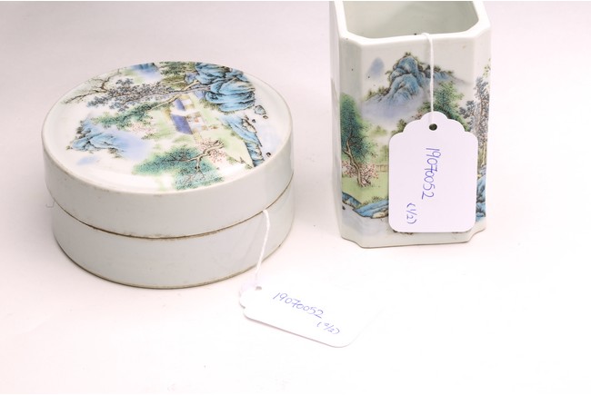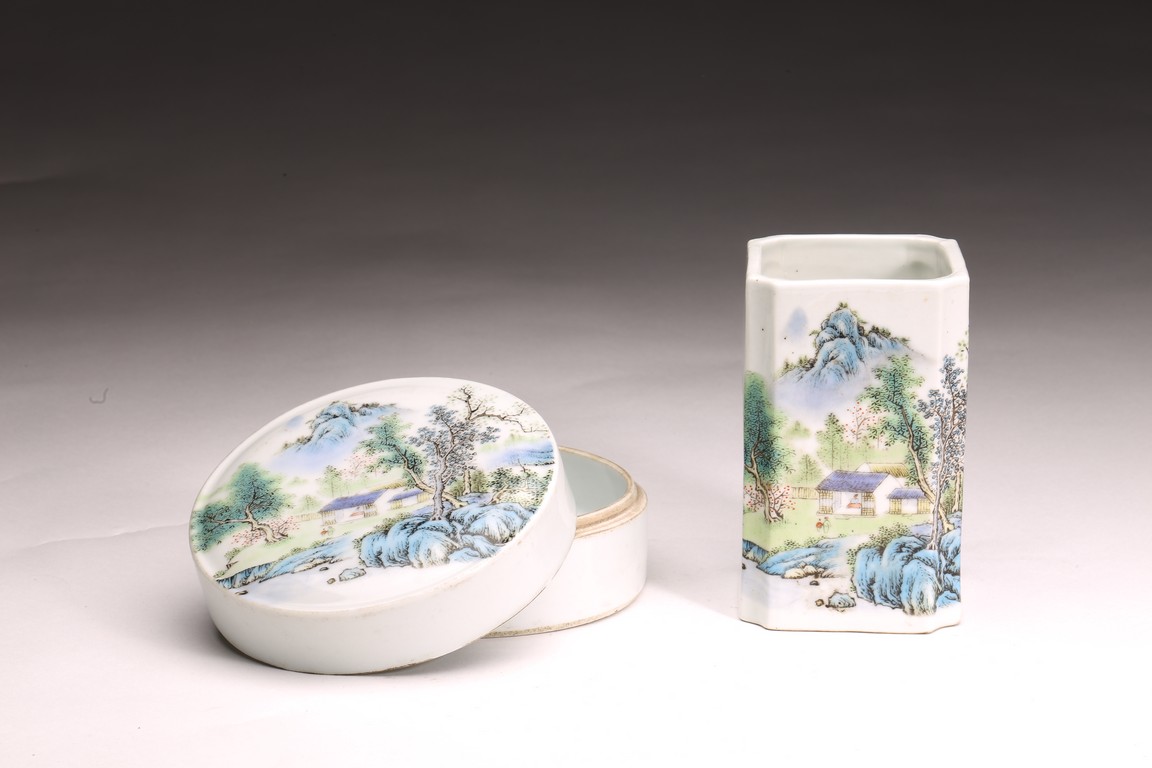 Republic period. Comprising of a square form brushpot decorated with landscape scene; and a circular ink box with landscape scene decorated on cover top. Base with mark 'Jiang Xi Ci Ye Gong Si' (Jiangxi Ceramic Company).
