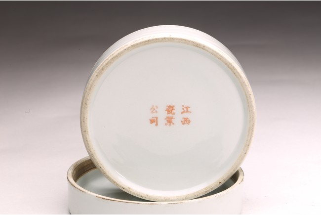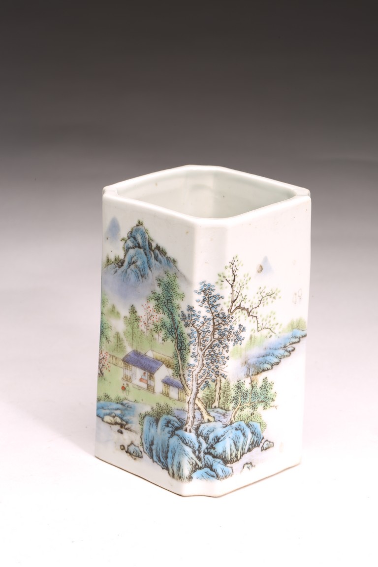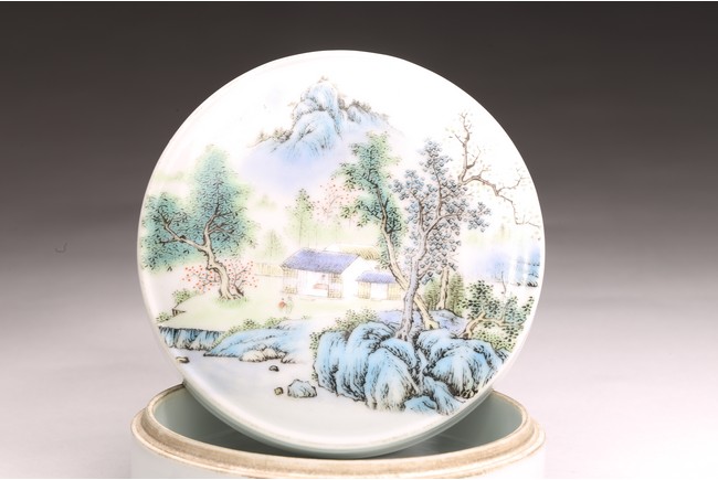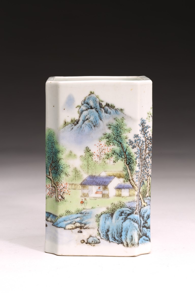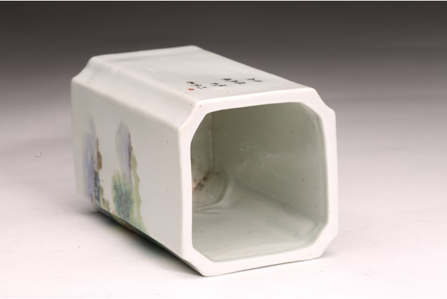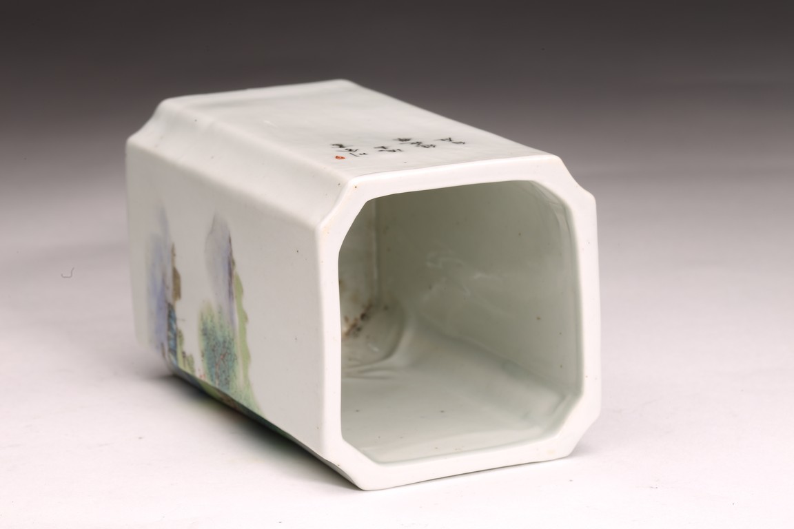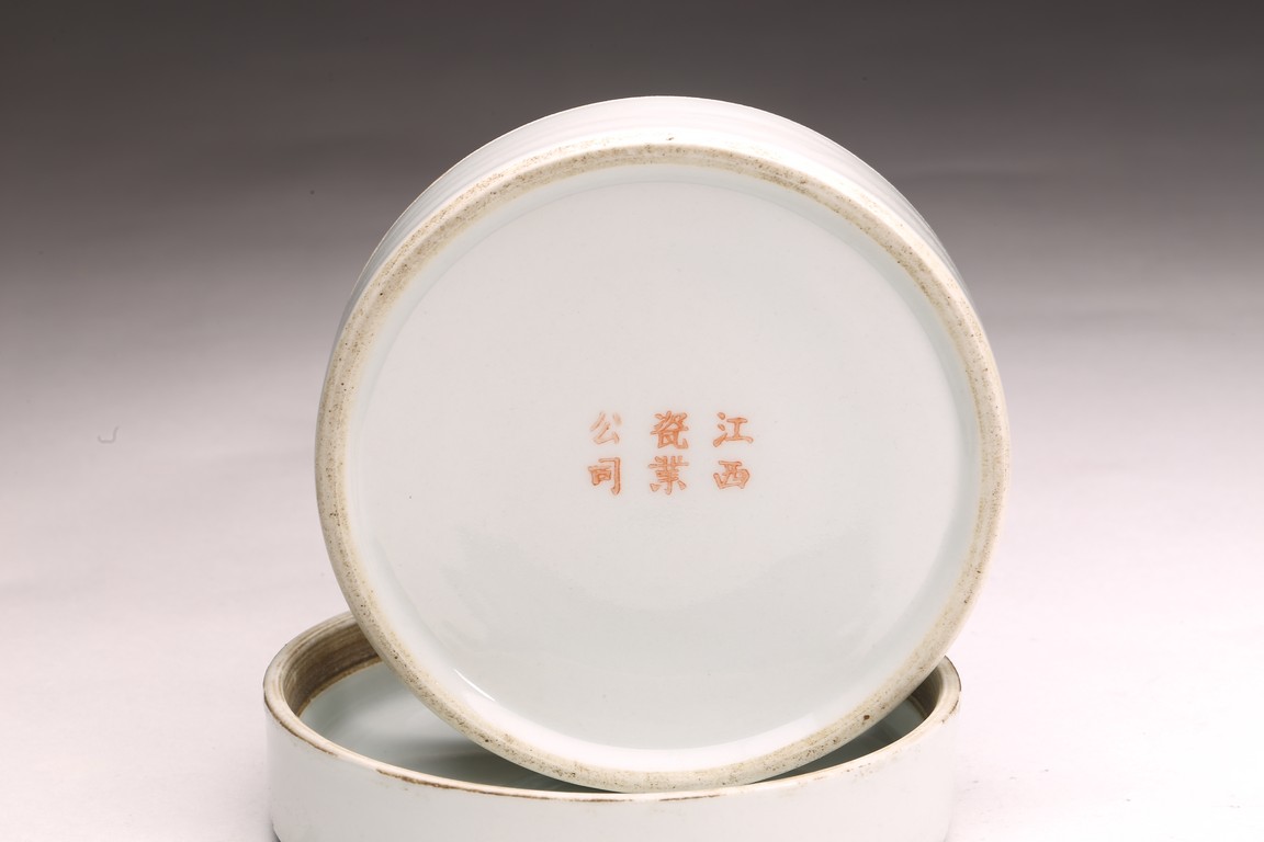 Republic period. Comprising of a square form brushpot decorated with landscape scene; and a circular ink box with landscape scene decorated on cover top. Base with mark 'Jiang Xi Ci Ye Gong Si' (Jiangxi Ceramic Company).