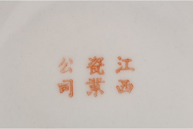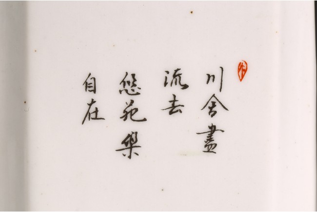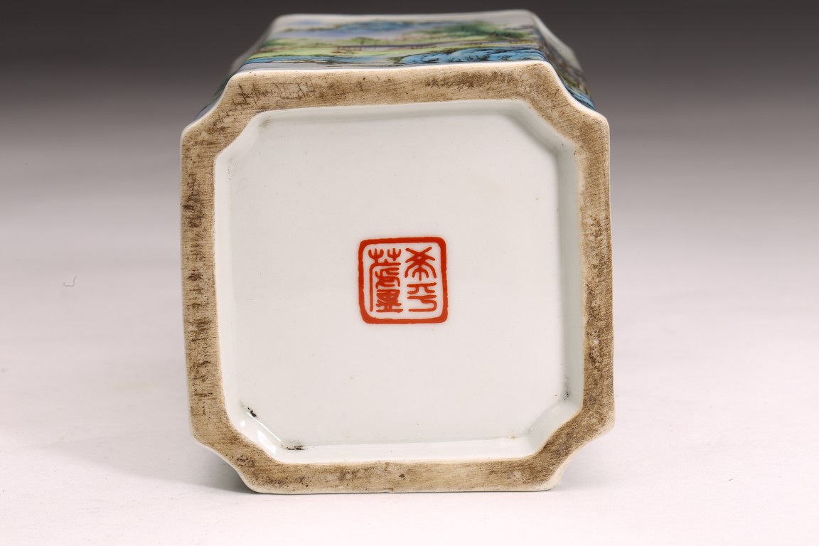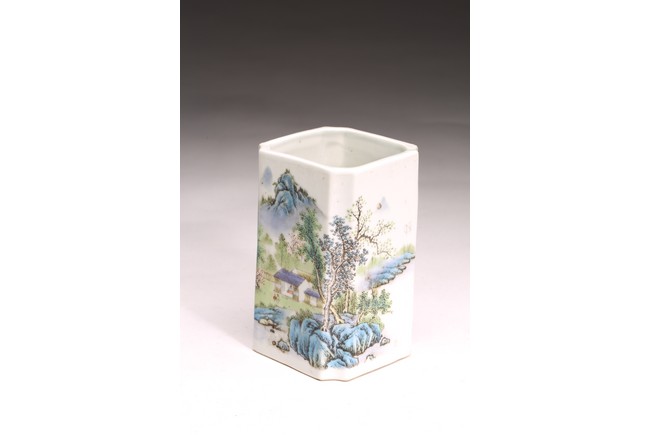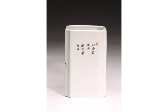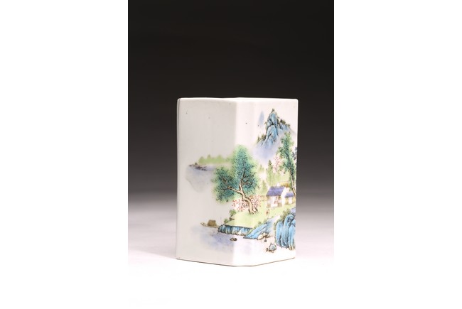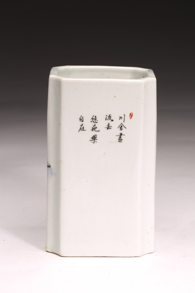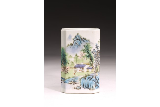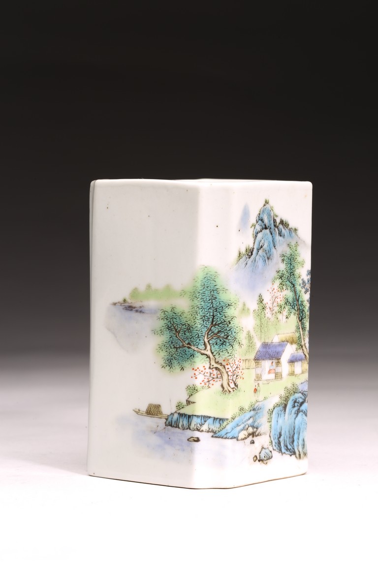 Republic period. Comprising of a square form brushpot decorated with landscape scene; and a circular ink box with landscape scene decorated on cover top. Base with mark 'Jiang Xi Ci Ye Gong Si' (Jiangxi Ceramic Company).