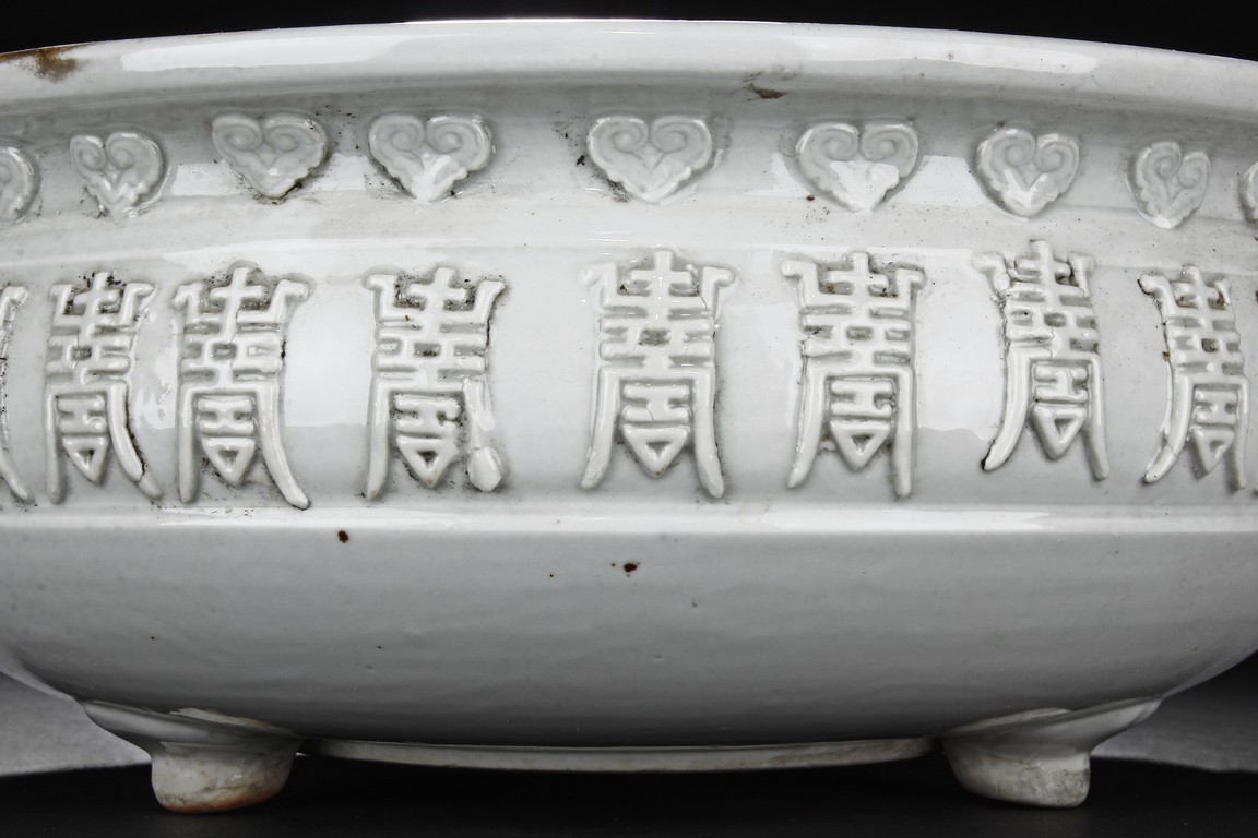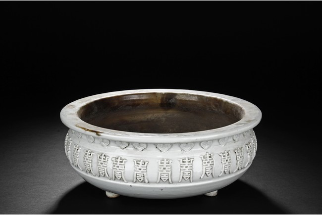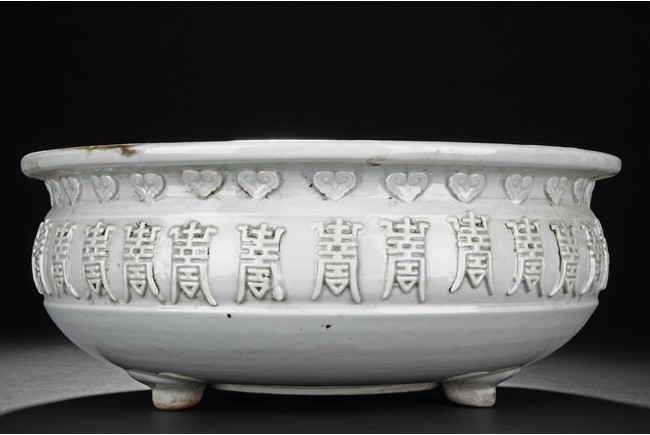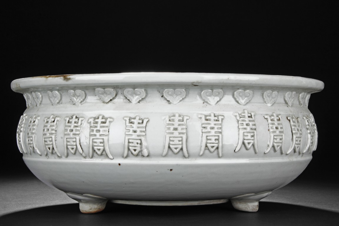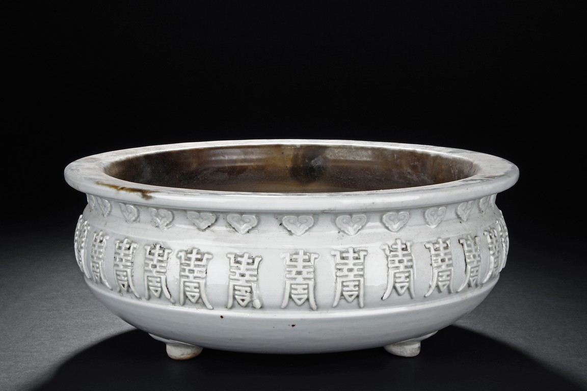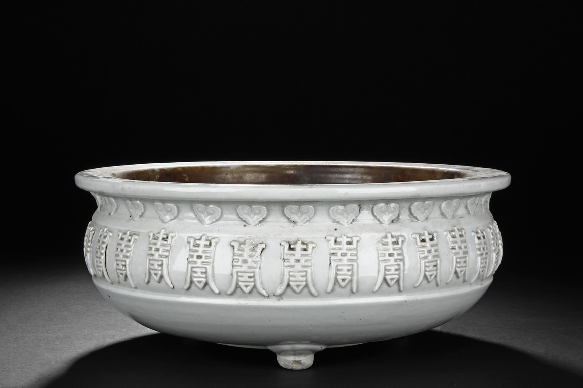 A WHITE-GLAZED TRIPOD CENSER 清 白釉壽字三足爐