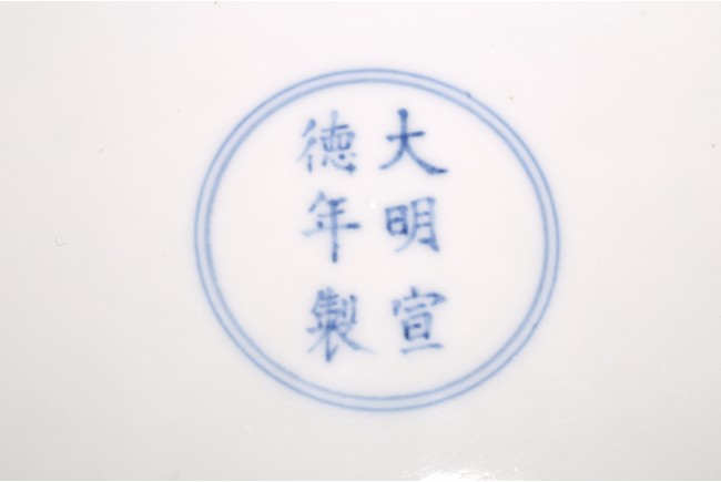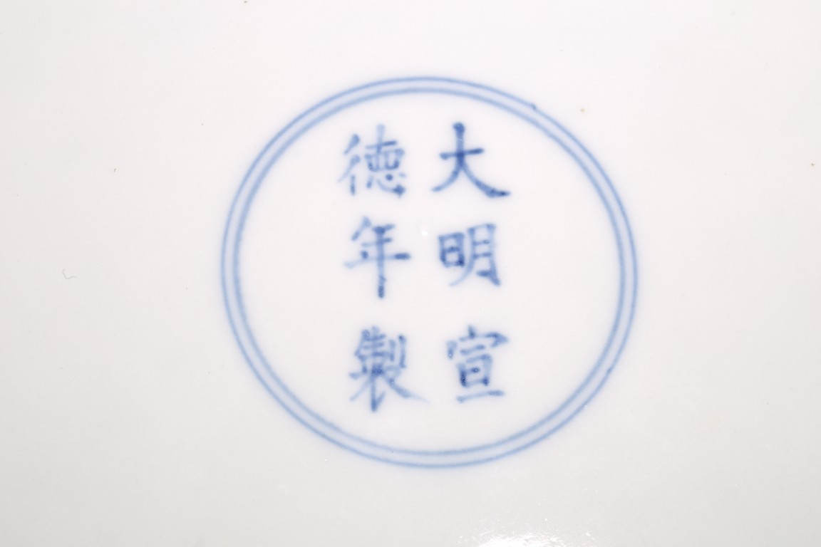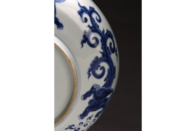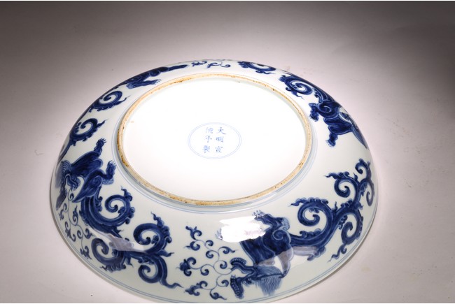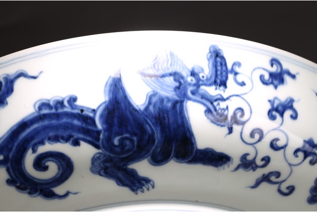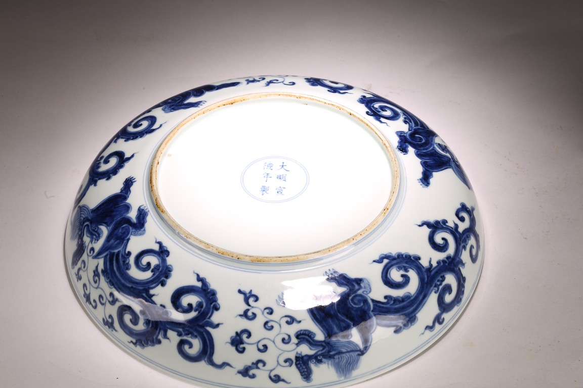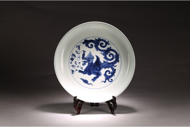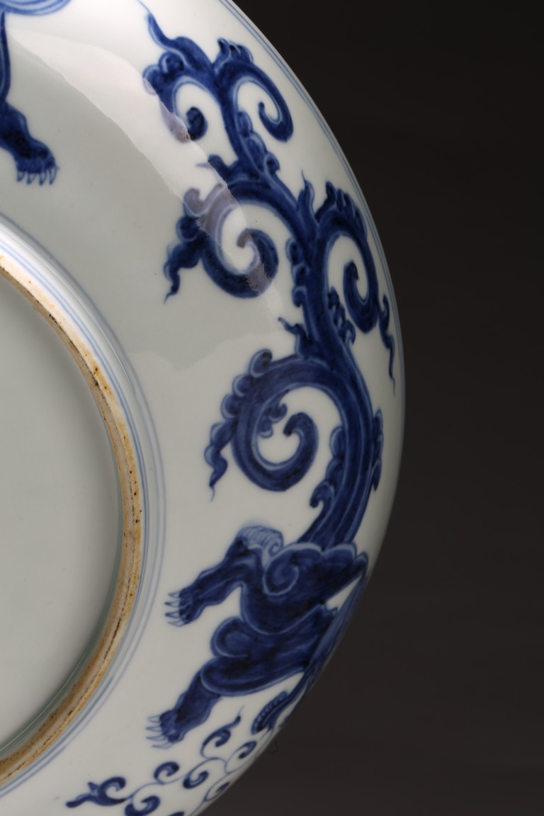 Qing Dynasty period.(17th C.-19th C.) Rising from a circular foot ring and potted with shallow sides, the dish is painted to the interior center in cobalt blue to depict a powerful qilin with splitting tails and agape mouth, with foliate scroll issuing from mouth, all enclosed by double circle borders. The exterior is further decorated with a continuous scene of four similar qilin above the foot. The base bears a six character 'XUANDE' mark within double circle borders.
