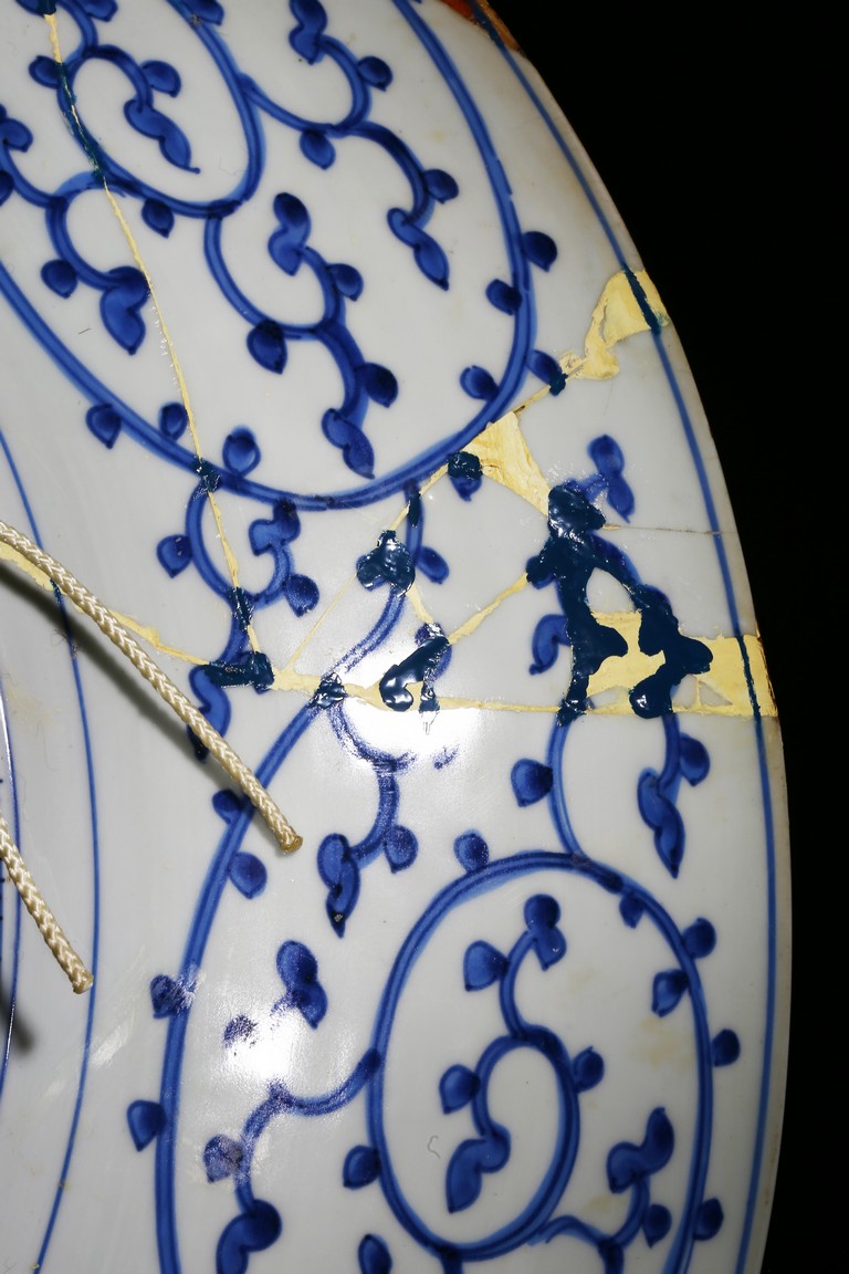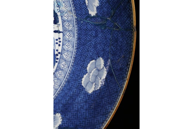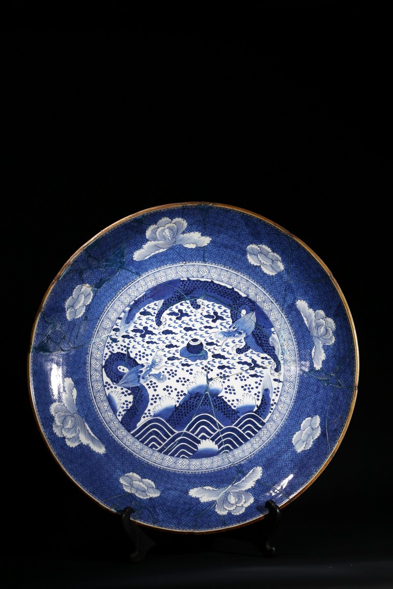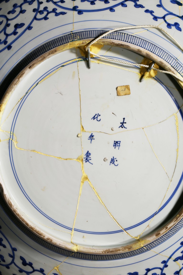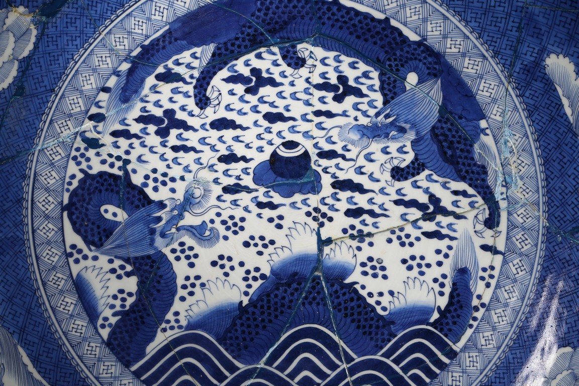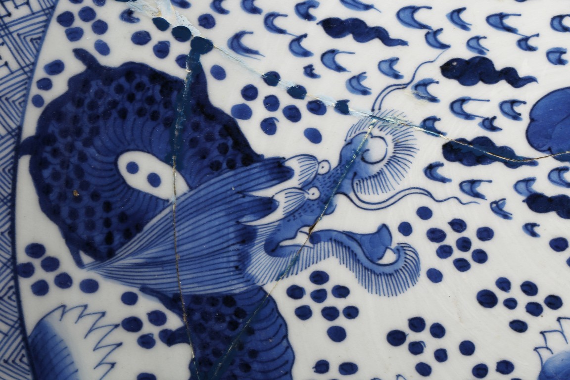 Qing Dynasty period. The interior finely decorated with two ferocious dragon chasing flaming pearl within a medallion, encircled by a geometric band and alternating floral motif, the base with six character apocryphal Chenghua mark.