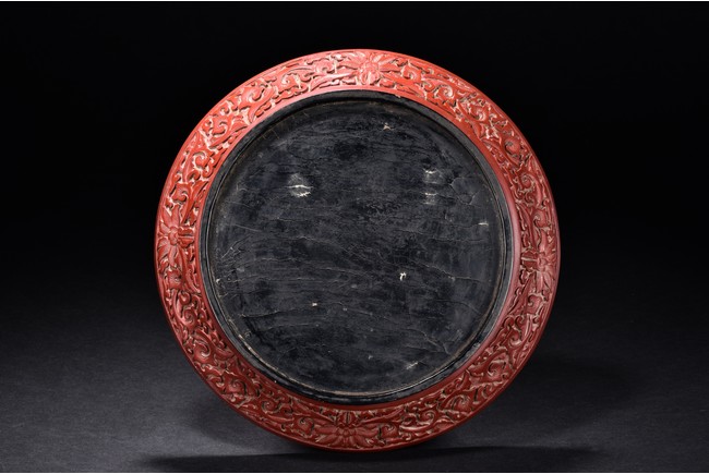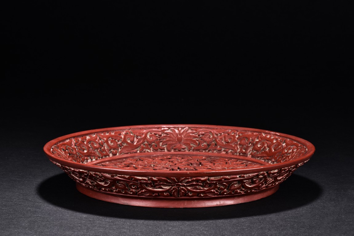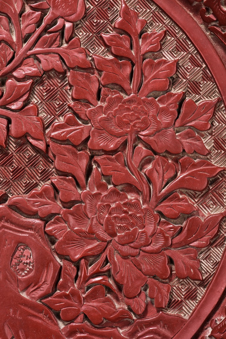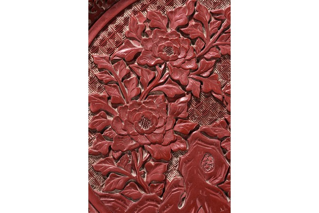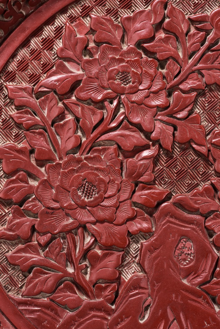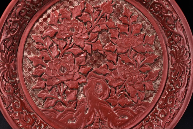 The circular dish decorated with four leafy blossoming peonies issuing from the rockwork all against the leiwen ground. The frieze to the exterior is carved with scrolling foliate patterns. The base is applied with black lacquer.