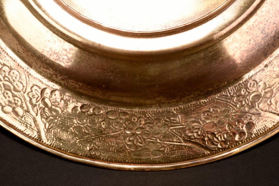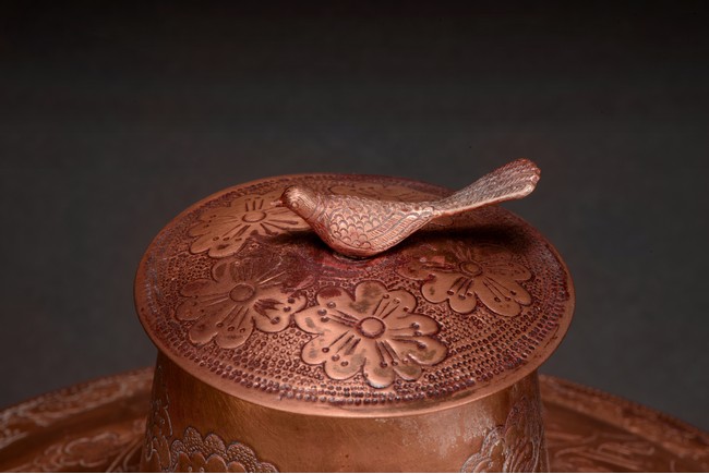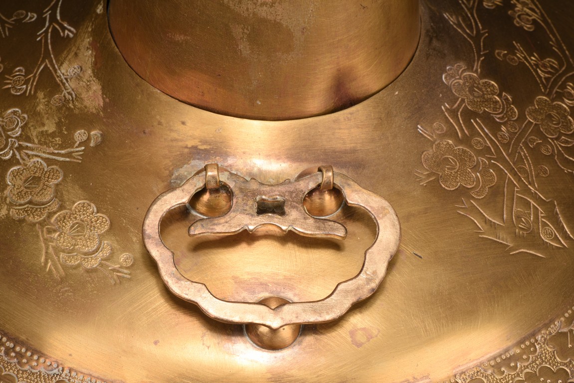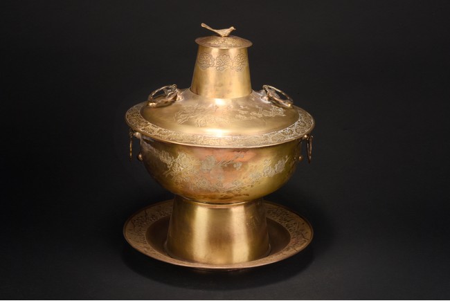 The food pot with steep rounded sides, supported on a tall foot, the body etched with leafy plum pattern, flanked by two loose ring handles, the cover further decorated with similar plum design, topped with a bird finial. Republic period.