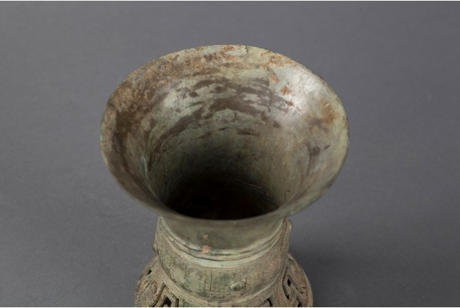 The body decorated with a band of taotie mask reserved on dense lei pattern, flanked by reticulated stylized band below and two raised bands of circles above.