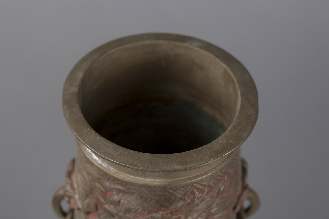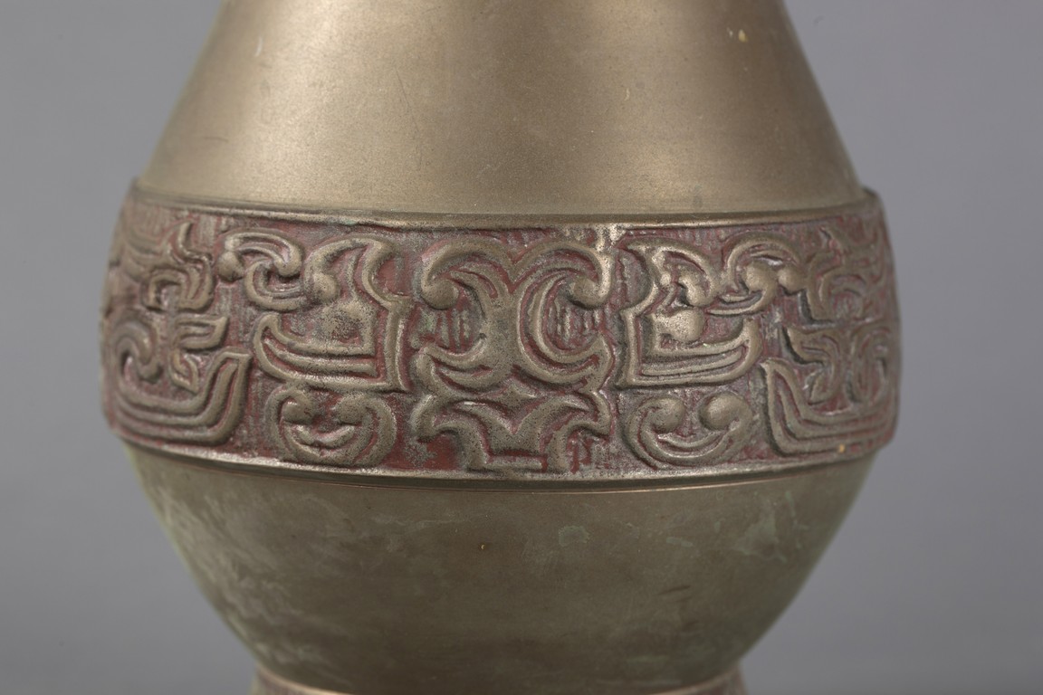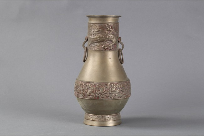 Of bulbous form, the body cast with a band of stylized motif, the neck cast with a band of raised dragon flanked by a pair of loose handles.