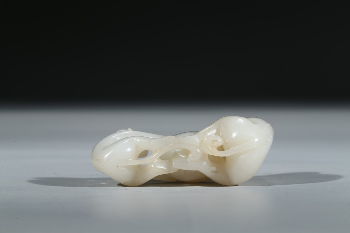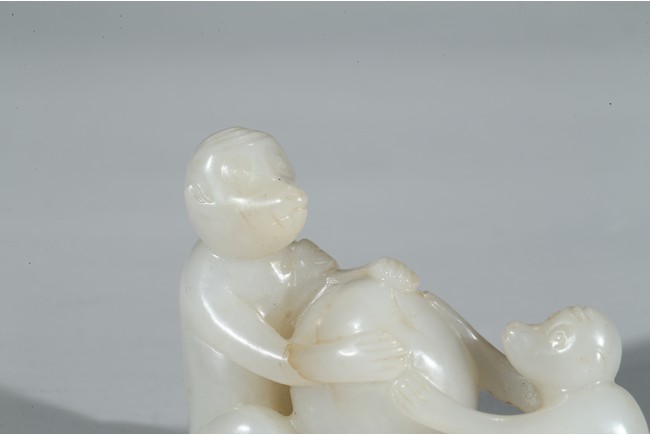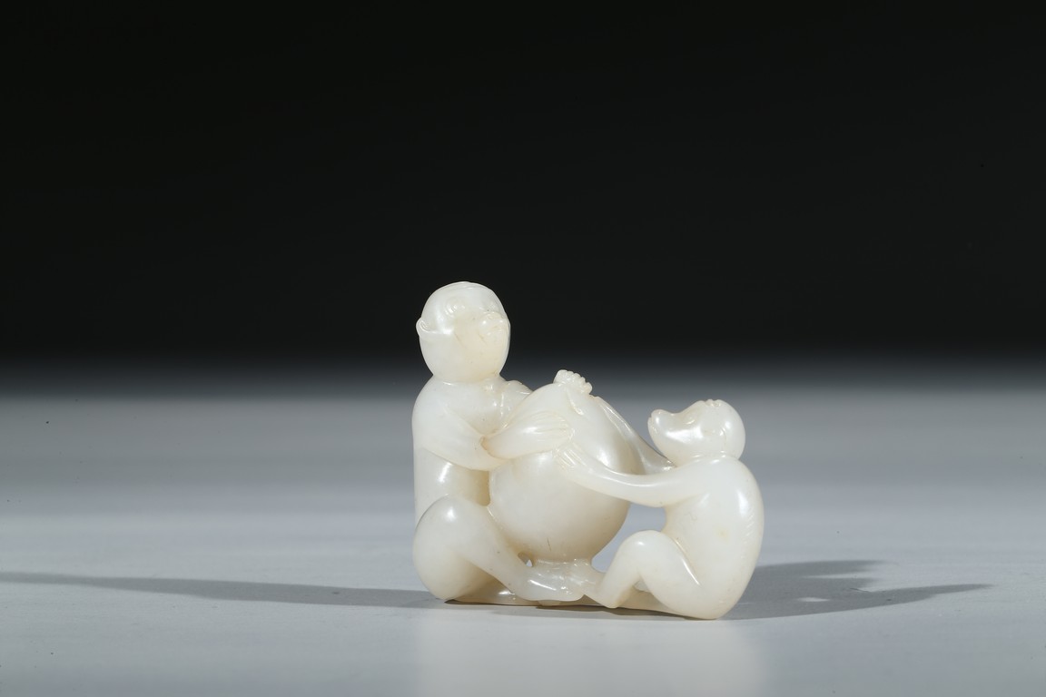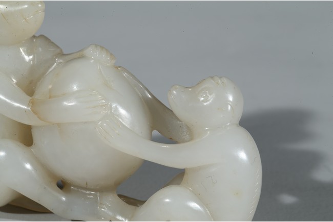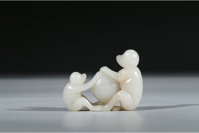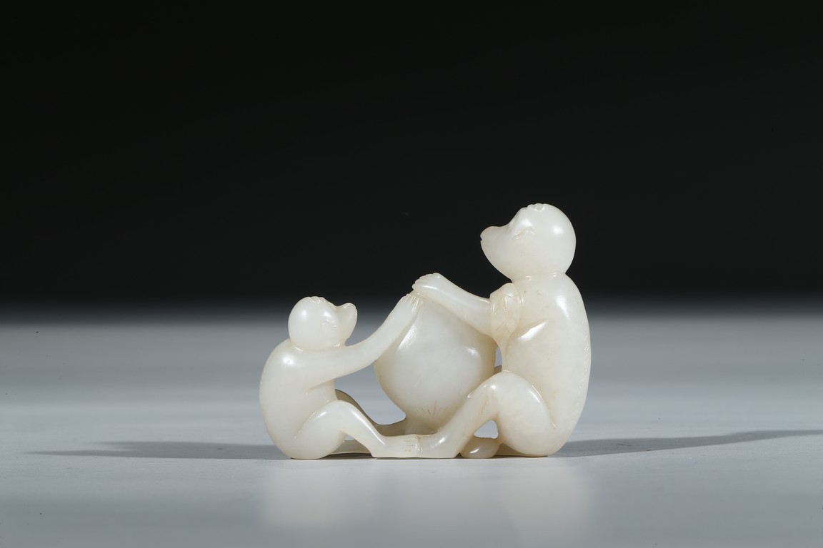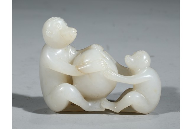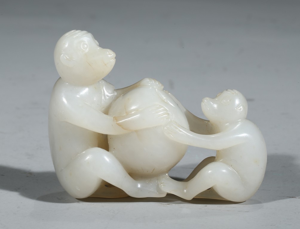 Qing Dynaty period (18th/19th C.) Well worked in the form of a seated monkey with both hands holding a large peach with a smaller seated monkey on the opposite side, both shown with head raised looking upwards, the stone is of well polished white tone.