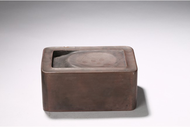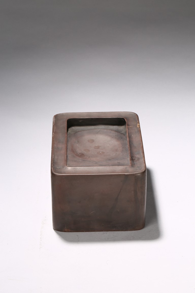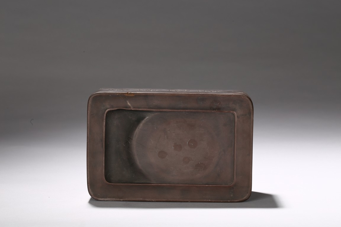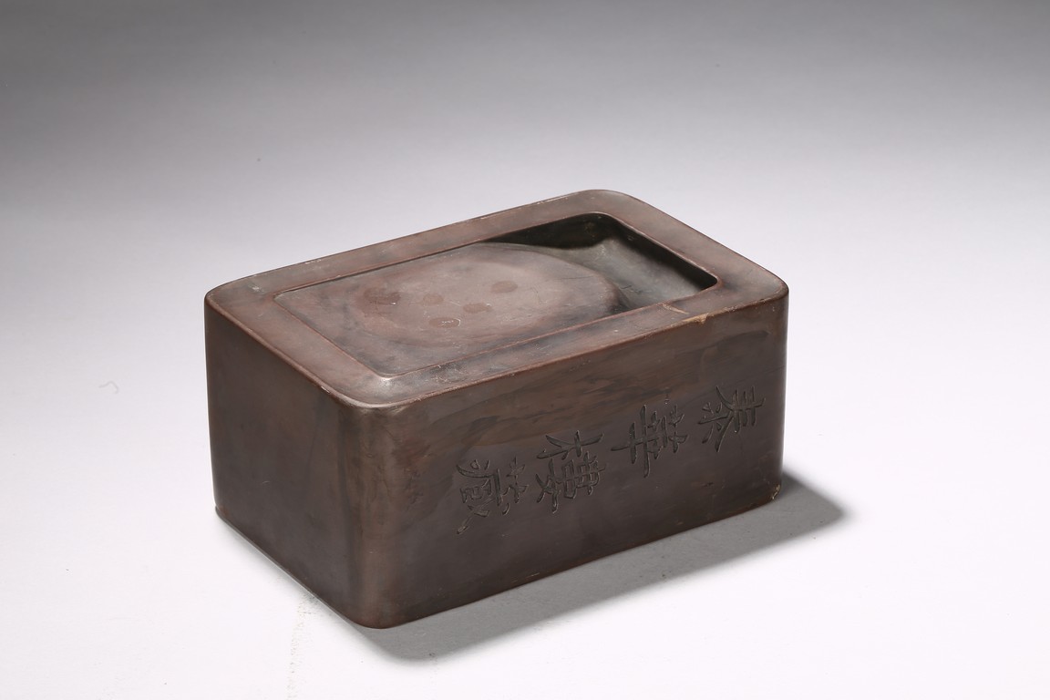 The rectangle inkstone is carved on top with a shaped grinding surface, the side finely incised with a four character inscription.