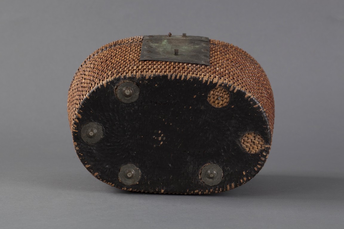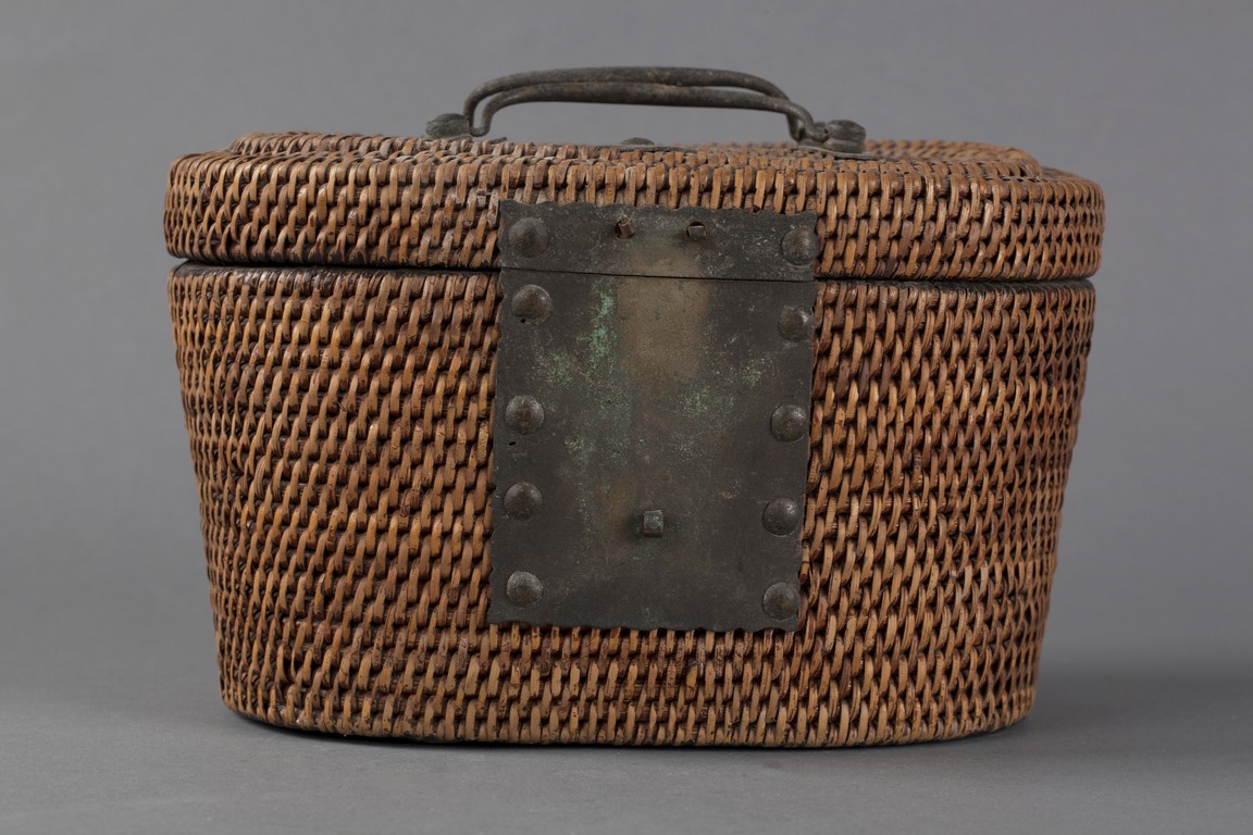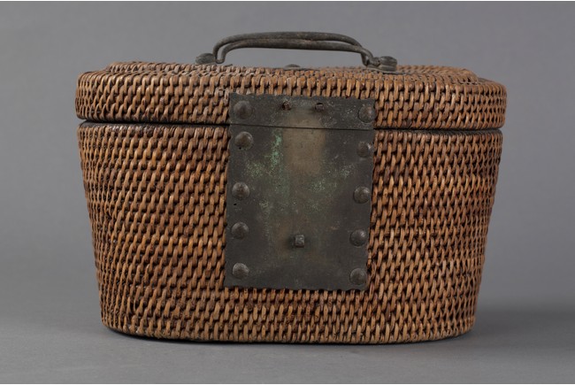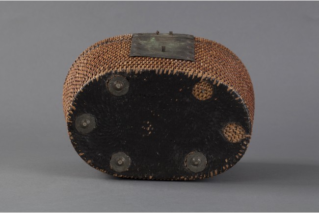 This well woven basket has two metal handles on top and metal dishes on the side for locking purposes. The basket is shaped like an oval and is slightly wider on top compared to the bottom.
