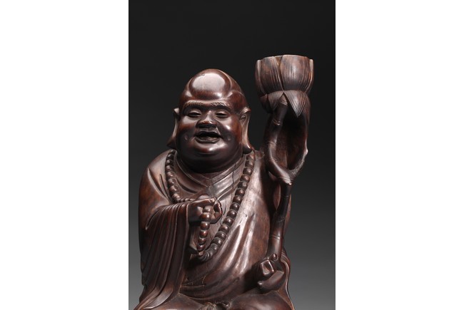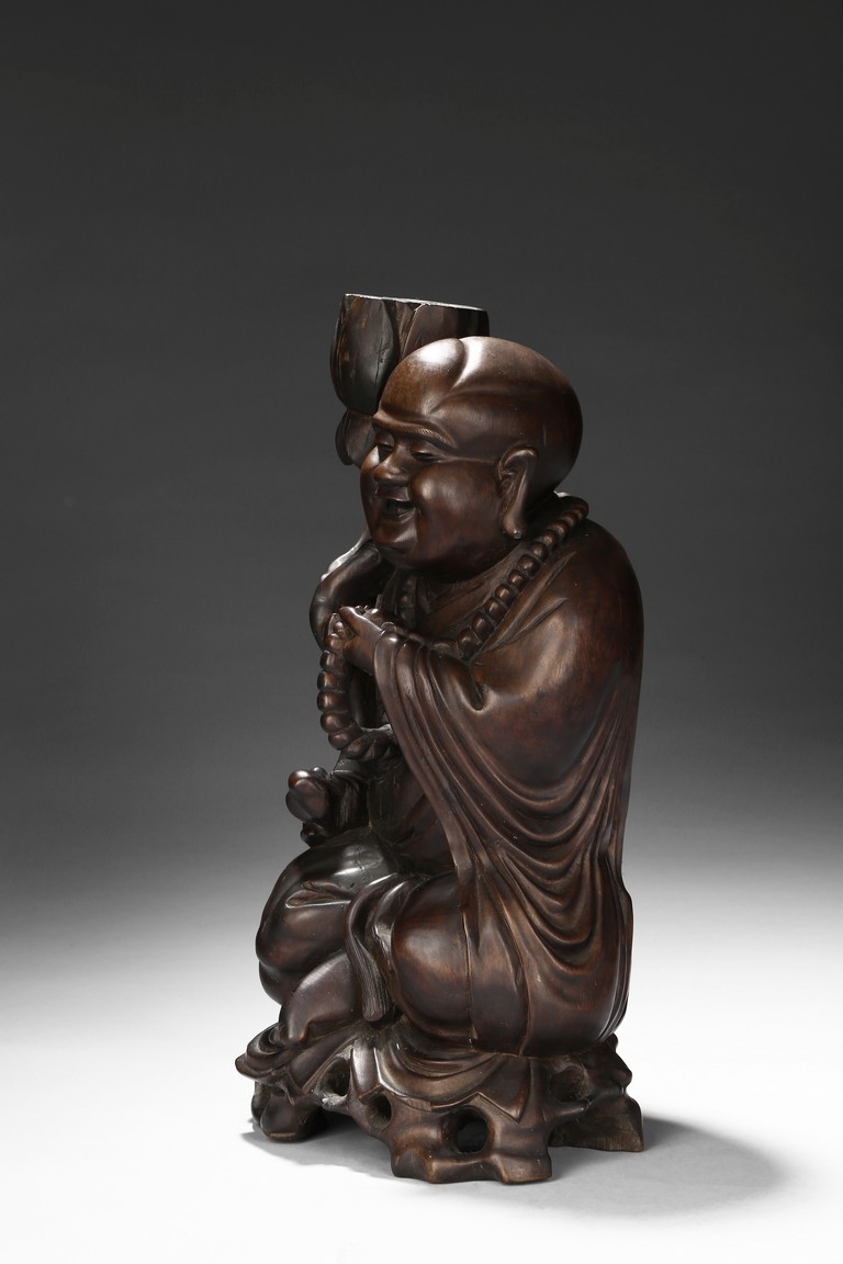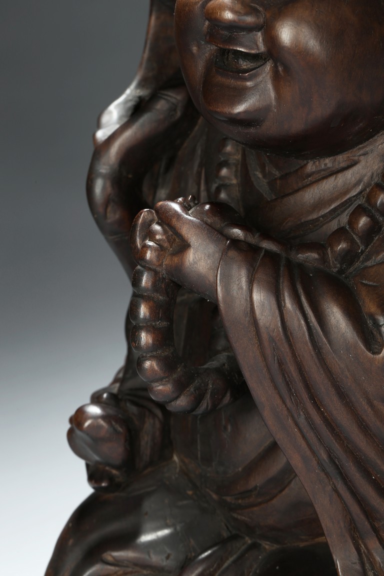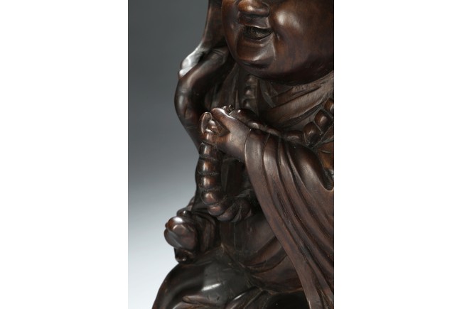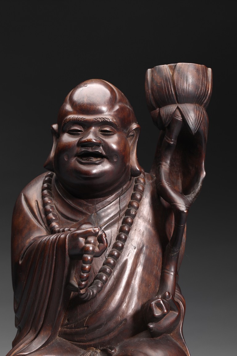 Republic period.The laughing monk is shown holding beaded necklace on left hand, wearing a large robe, joyful face flanked by two long earlobes.