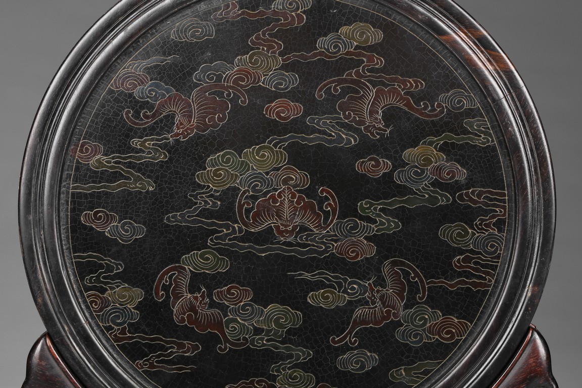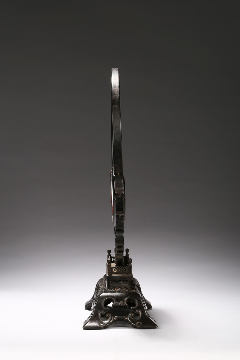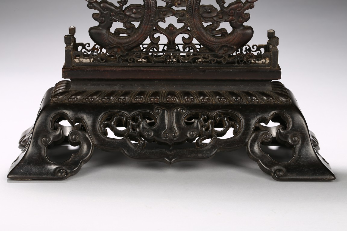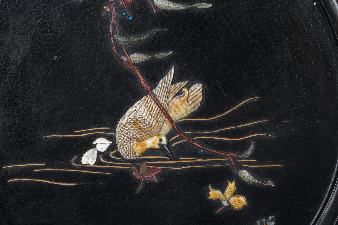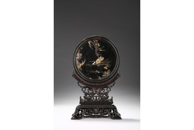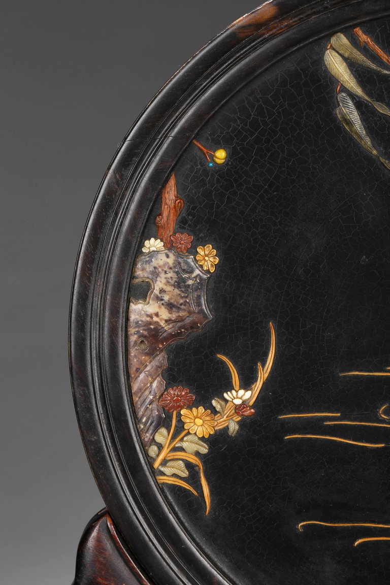 Circular screen with various gem inlaids to depict swimming ducks in pond, with reticulated wood stand.